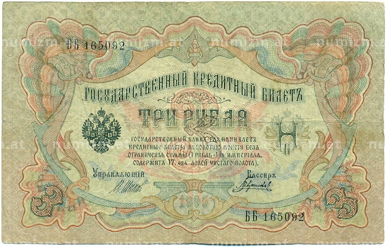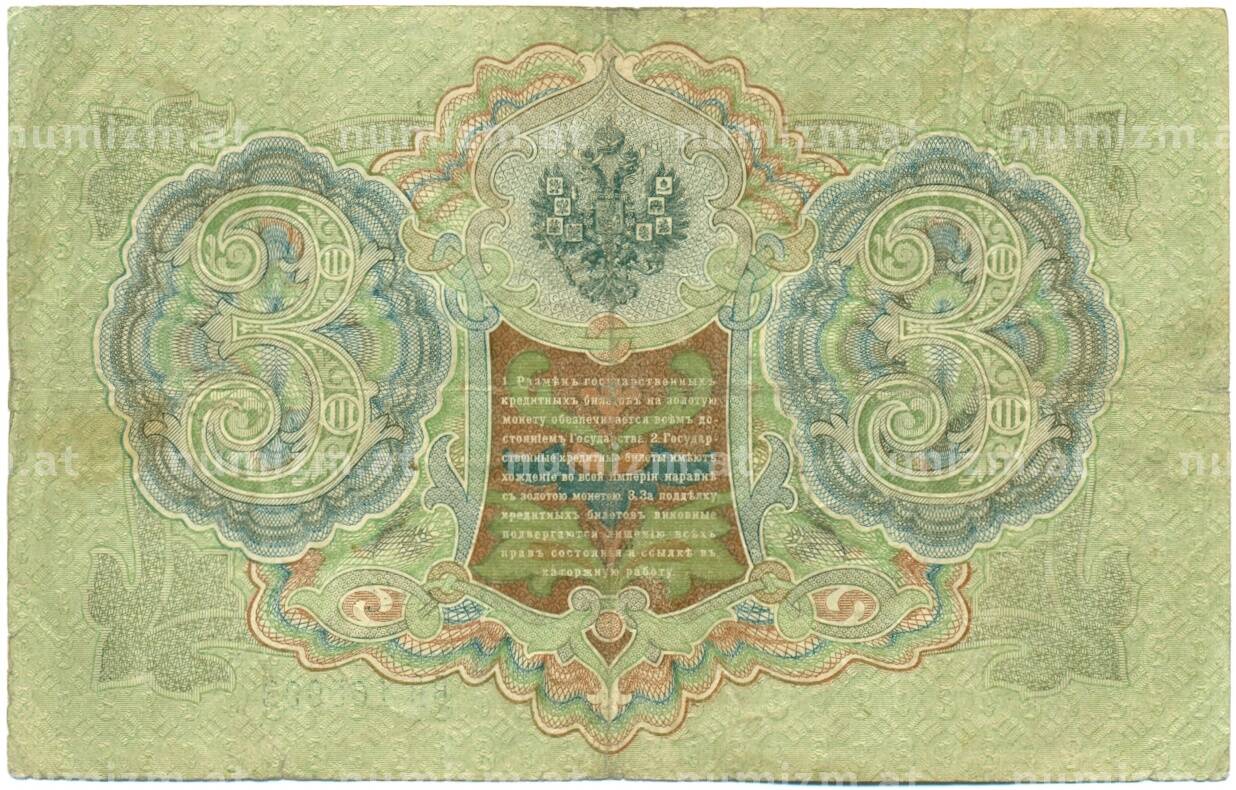 Банкнота 3 рубля 1905 года Шипов / Гаврилов (Артикул: K10-7846): подробные характеристики, качественные фотографии в высоком разрешении, низкая цена.