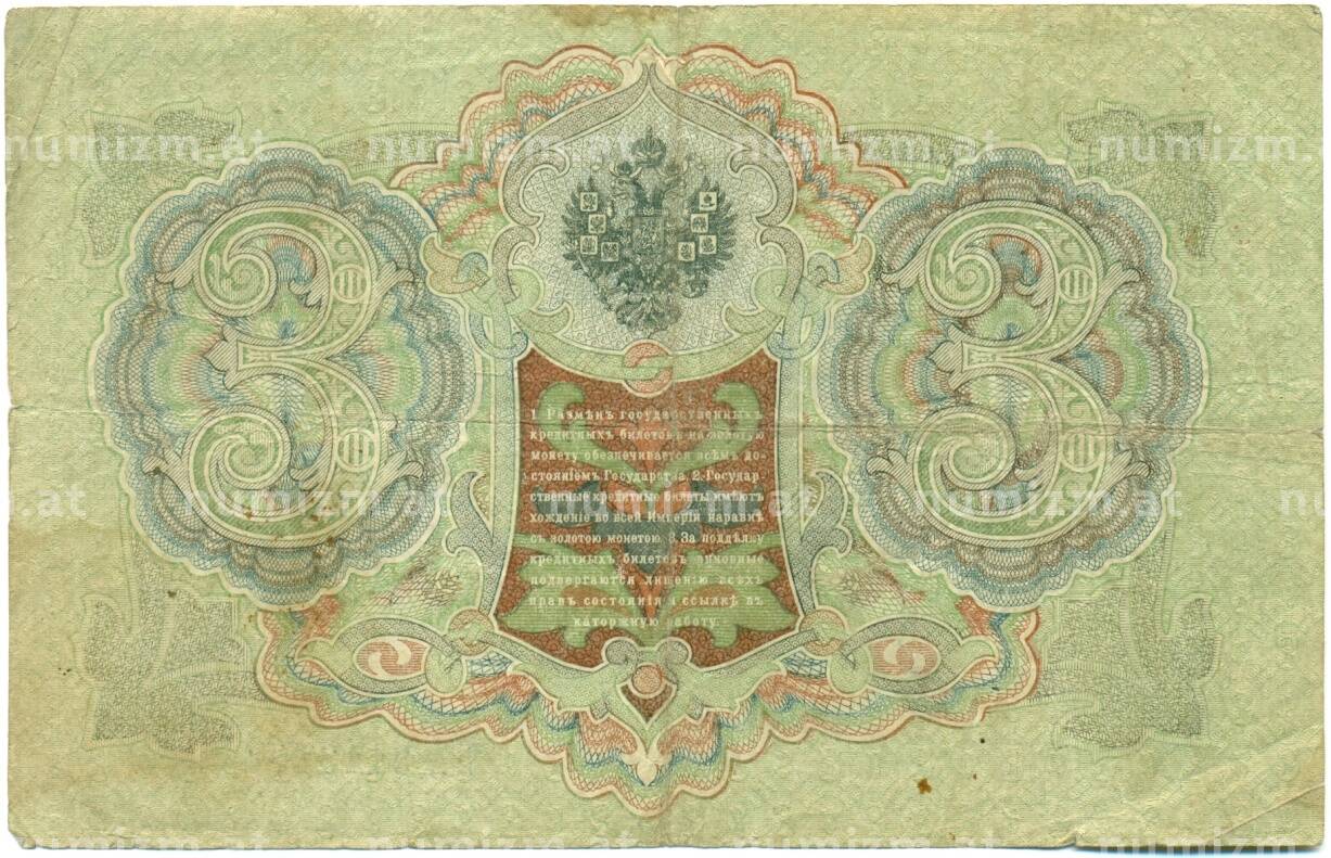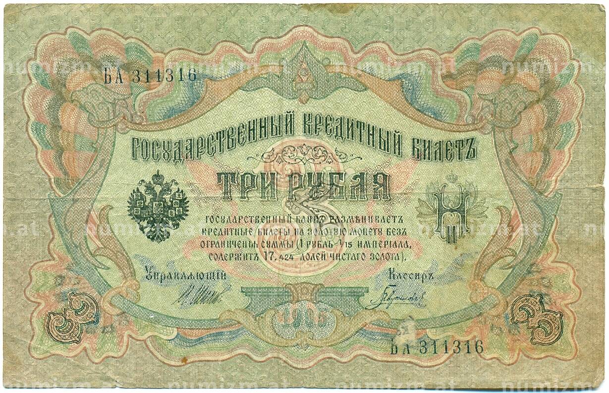 Банкнота 3 рубля 1905 года Шипов / Гаврилов (Артикул: K10-7847): подробные характеристики, качественные фотографии в высоком разрешении, низкая цена.