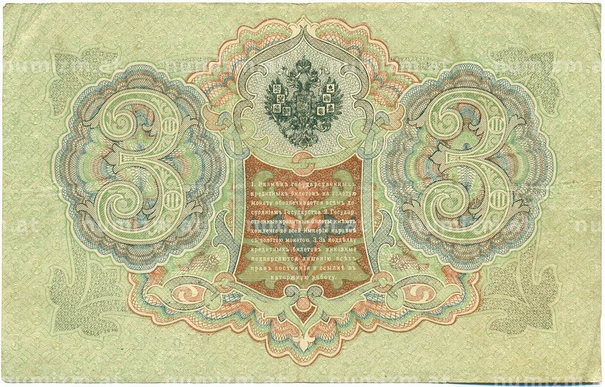 Банкнота 3 рубля 1905 года Шипов / Гаврилов (Артикул: K10-7853): подробные характеристики, качественные фотографии в высоком разрешении, низкая цена.