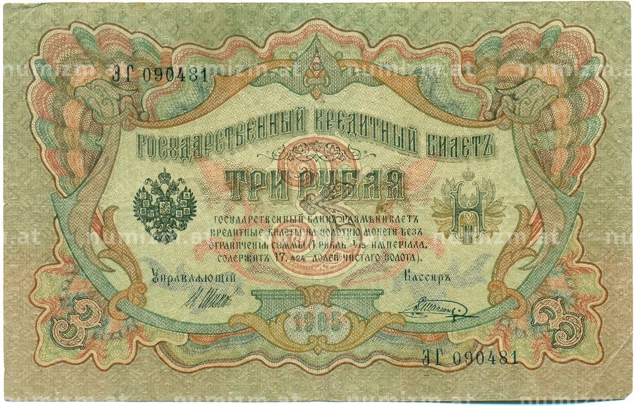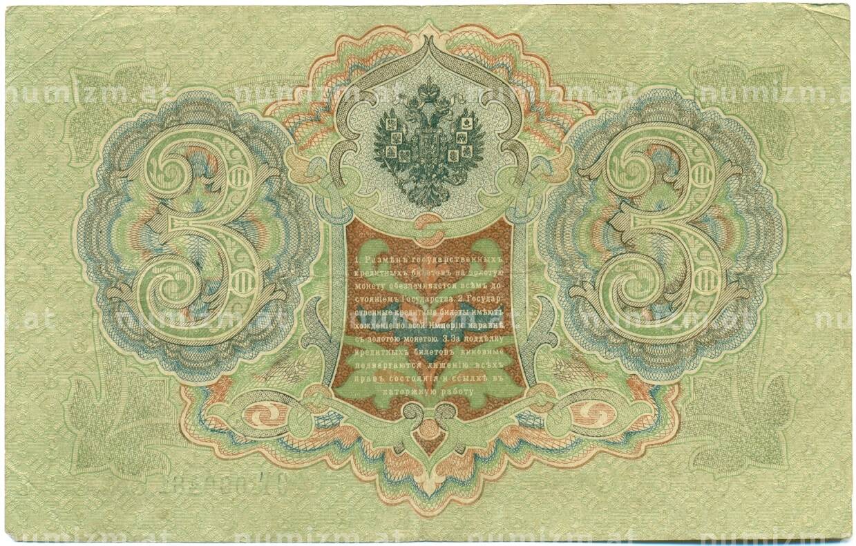Банкнота 3 рубля 1905 года Шипов / Шагин (Артикул: K10-7879): подробные характеристики, качественные фотографии в высоком разрешении, низкая цена.