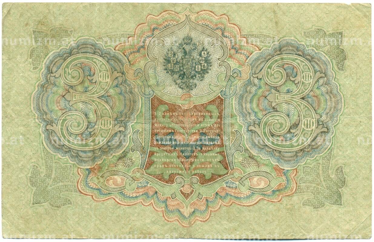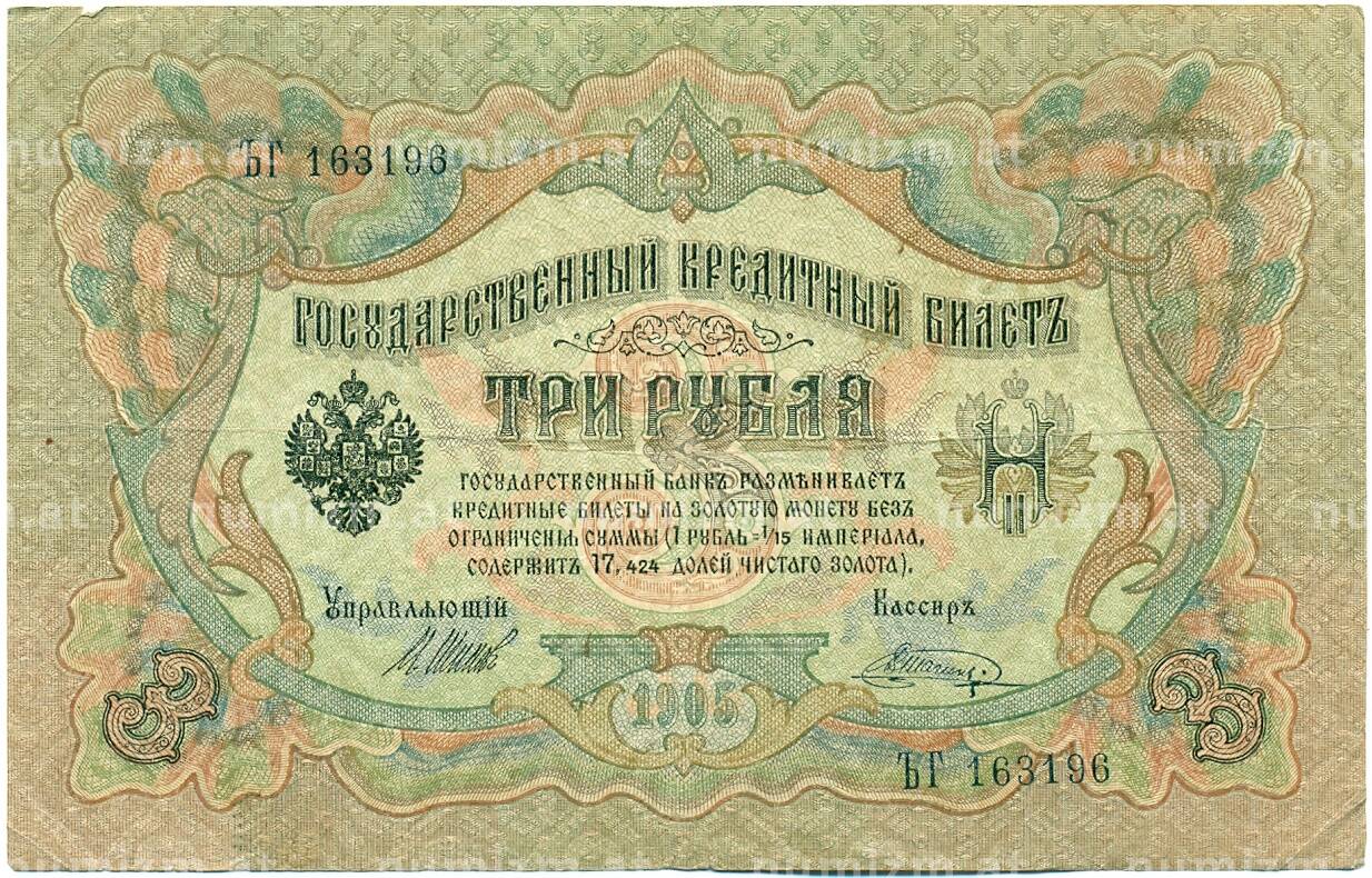 Банкнота 3 рубля 1905 года Шипов / Шагин (Артикул: K10-7884): подробные характеристики, качественные фотографии в высоком разрешении, низкая цена.
