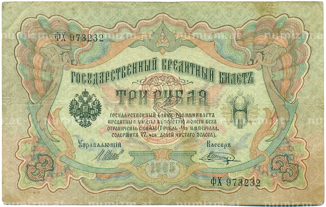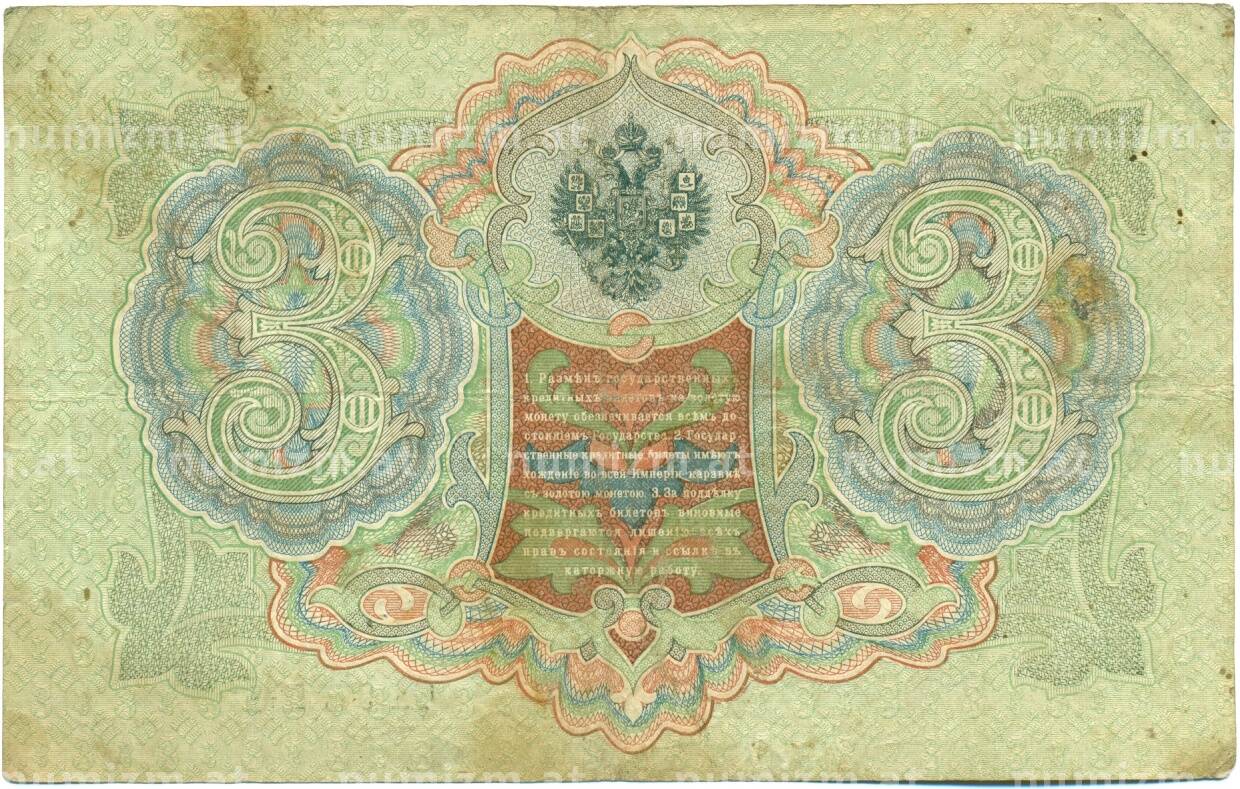 Банкнота 3 рубля 1905 года Шипов / Шагин (Артикул: K10-7885): подробные характеристики, качественные фотографии в высоком разрешении, низкая цена.