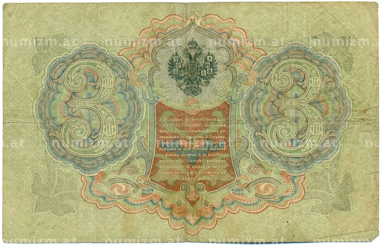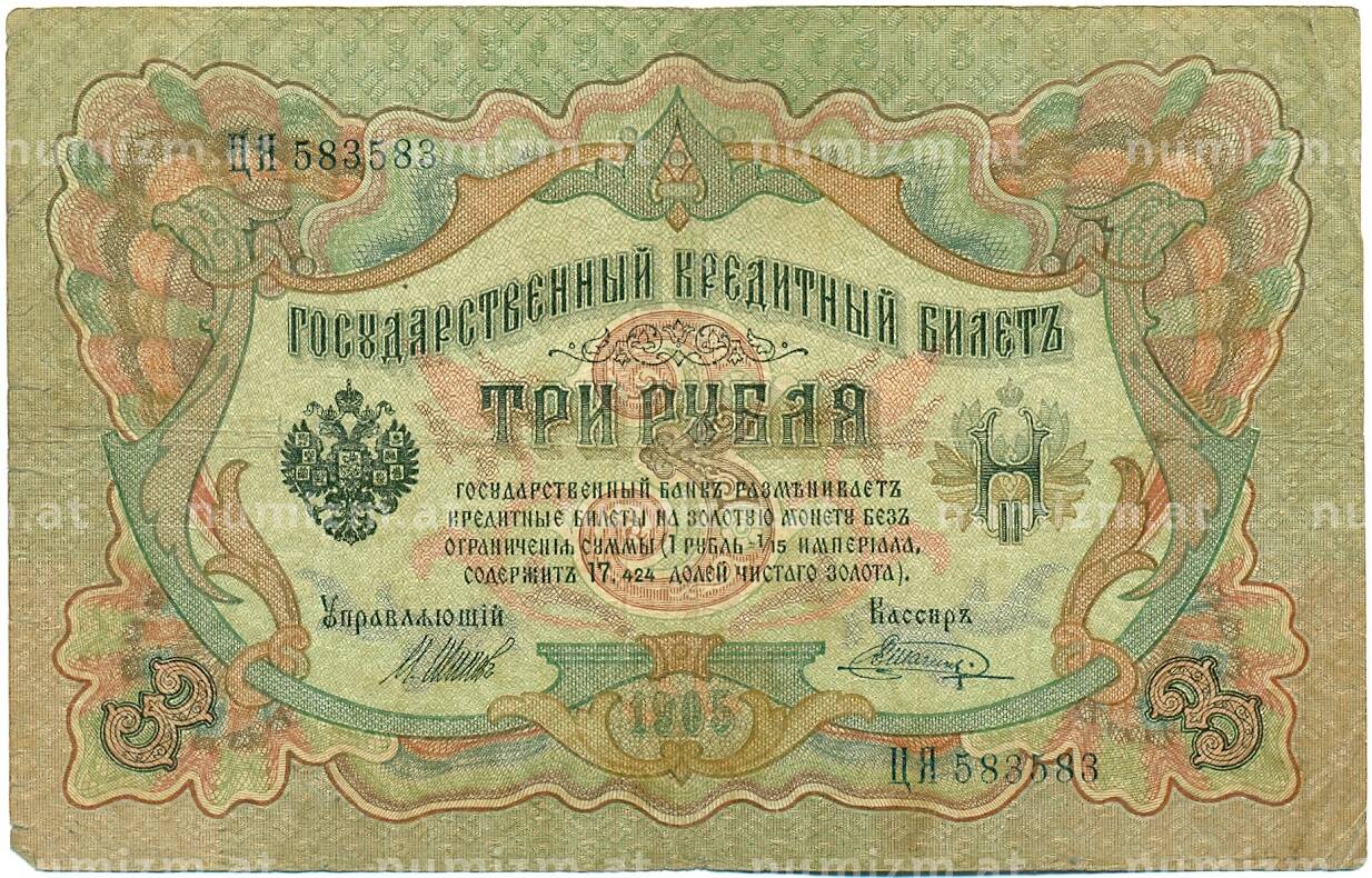 Банкнота 3 рубля 1905 года Шипов / Шагин (Артикул: K10-7886): подробные характеристики, качественные фотографии в высоком разрешении, низкая цена.