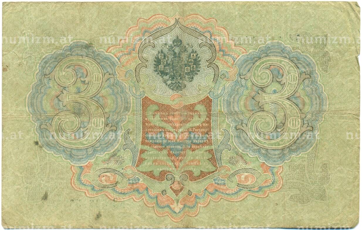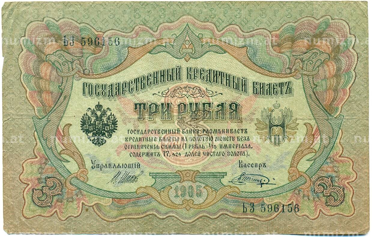 Банкнота 3 рубля 1905 года Шипов / Шагин (Артикул: K10-7891): подробные характеристики, качественные фотографии в высоком разрешении, низкая цена.