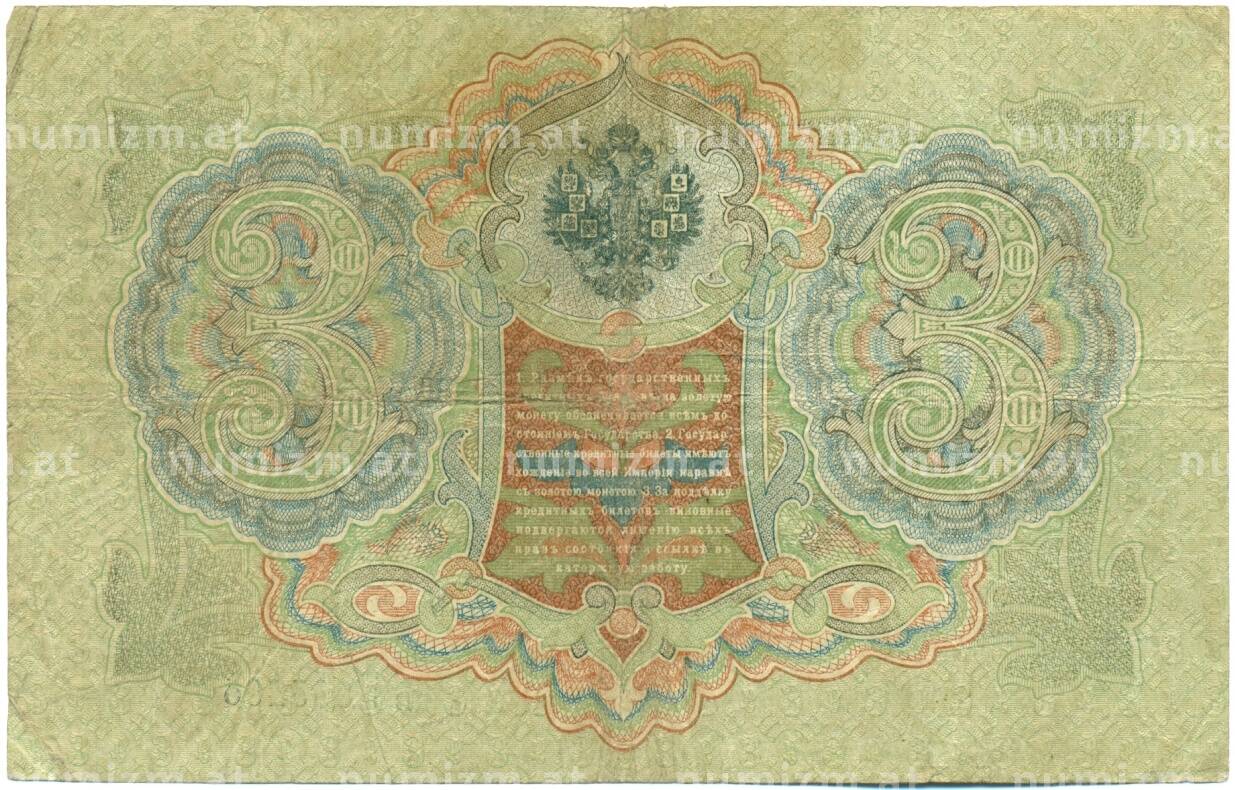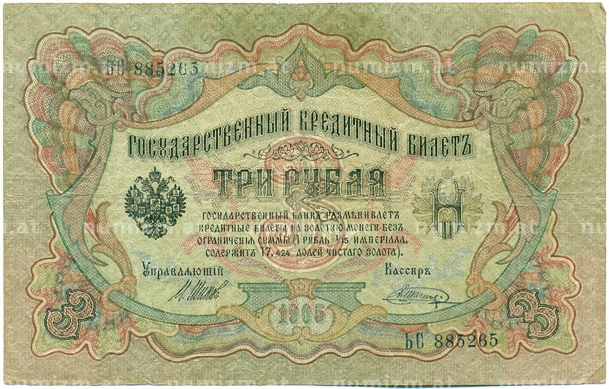 Банкнота 3 рубля 1905 года Шипов / Шагин (Артикул: K10-7892): подробные характеристики, качественные фотографии в высоком разрешении, низкая цена.