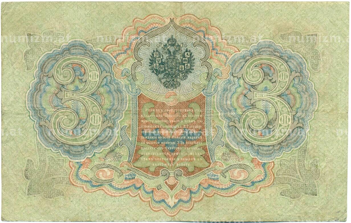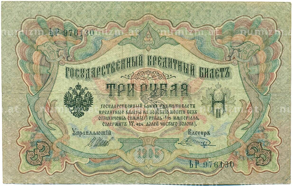 Банкнота 3 рубля 1905 года Шипов / Шагин (Артикул: K10-7908): подробные характеристики, качественные фотографии в высоком разрешении, низкая цена.