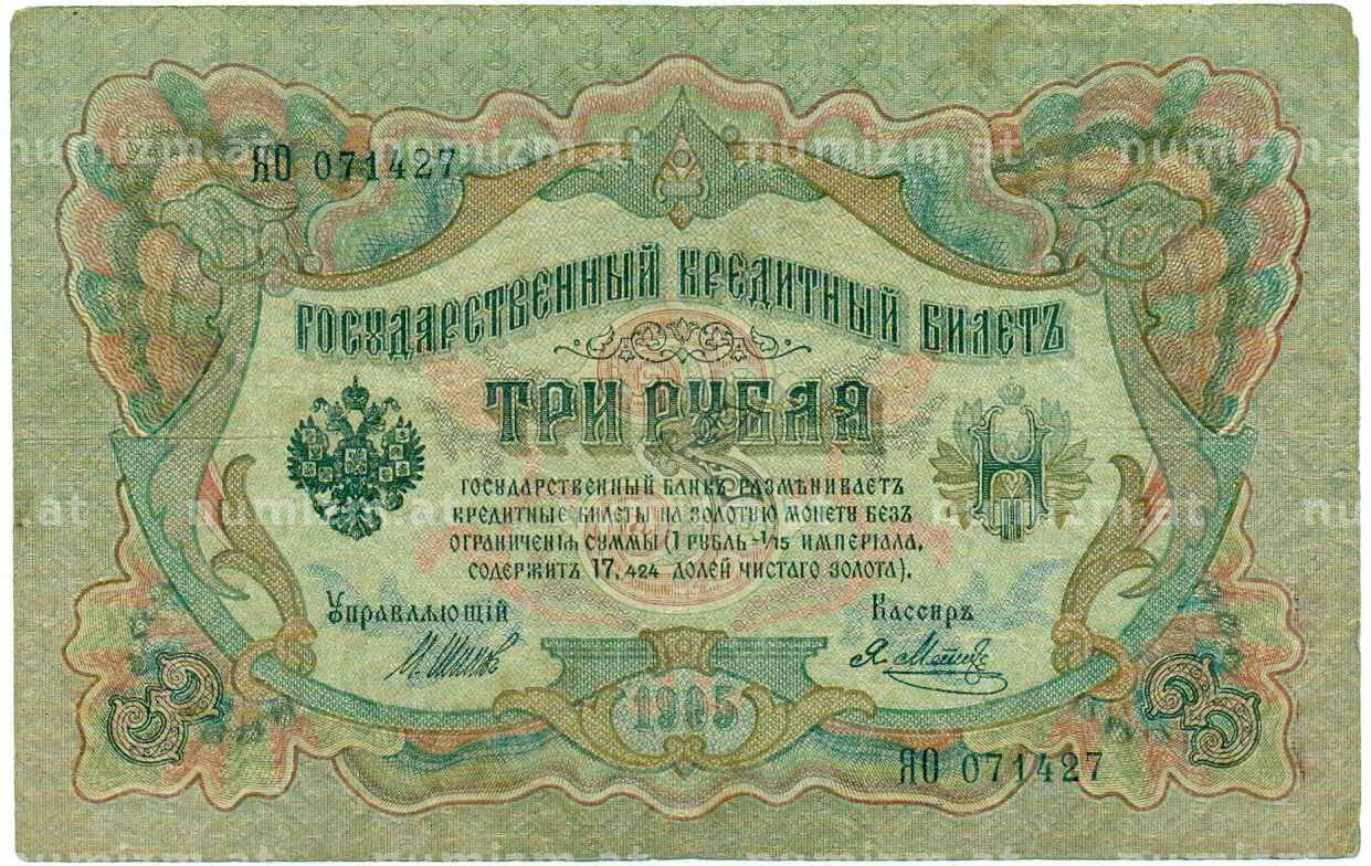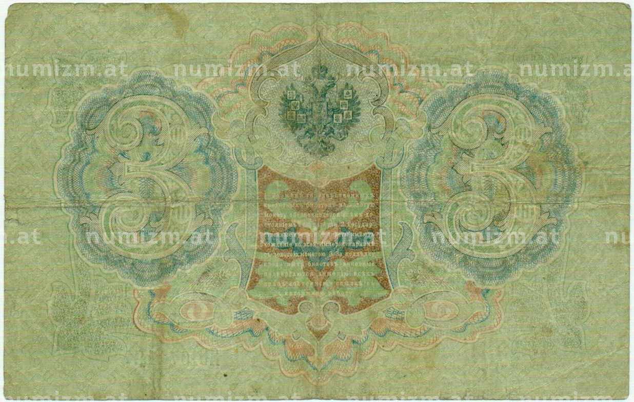 Банкнота 3 рубля 1905 года Шипов / Метц (Артикул: K10-7910): подробные характеристики, качественные фотографии в высоком разрешении, низкая цена.