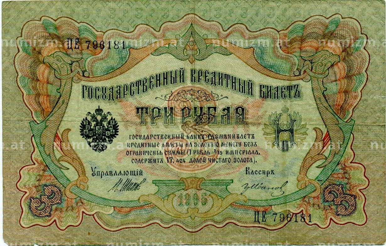 Банкнота 3 рубля 1905 года Шипов / Иванов (Артикул: K10-8036): подробные характеристики, качественные фотографии в высоком разрешении, низкая цена.