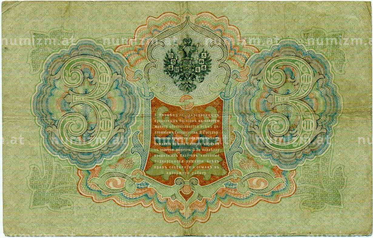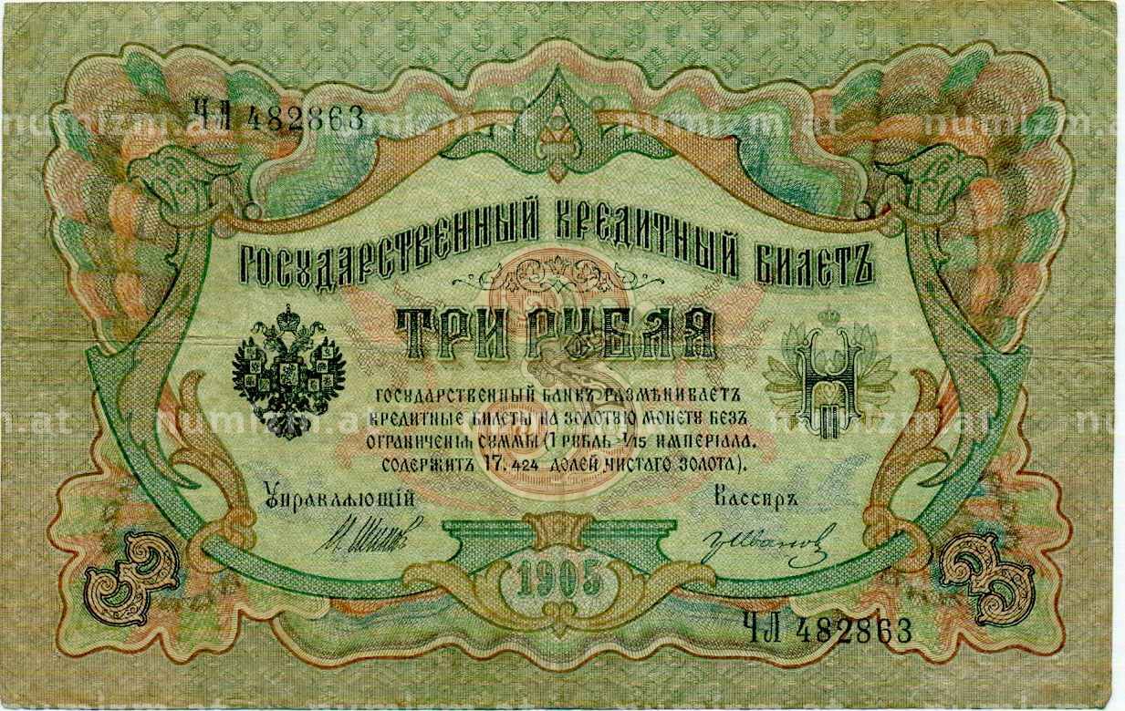 Банкнота 3 рубля 1905 года Шипов / Иванов (Артикул: K10-8037): подробные характеристики, качественные фотографии в высоком разрешении, низкая цена.