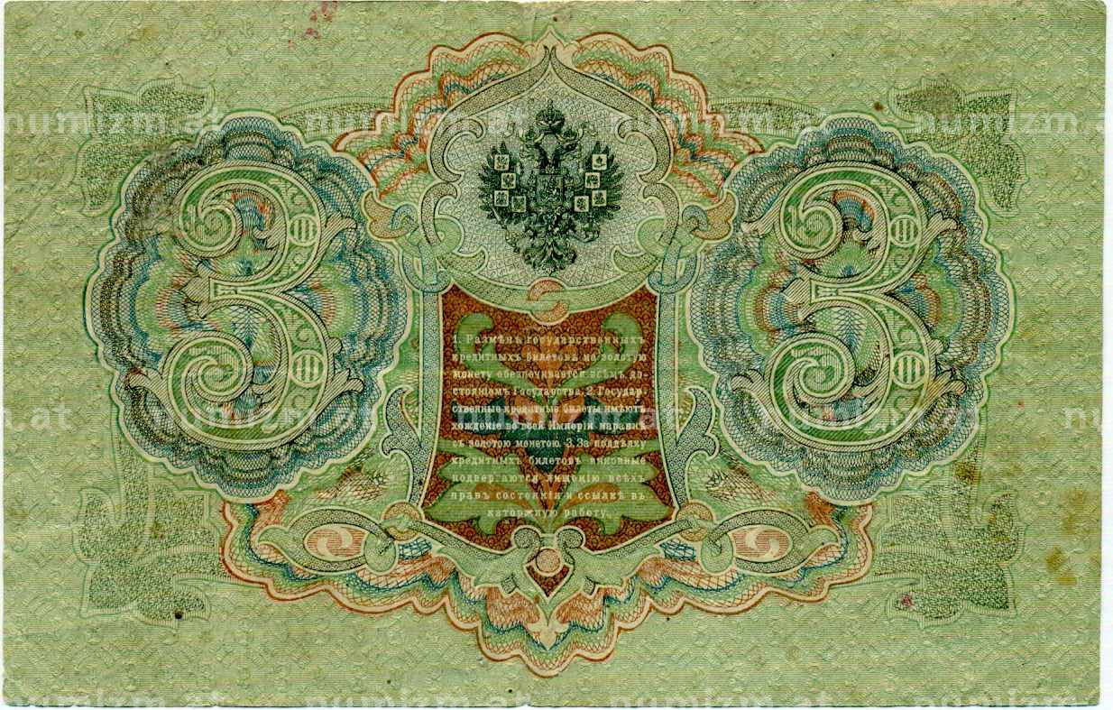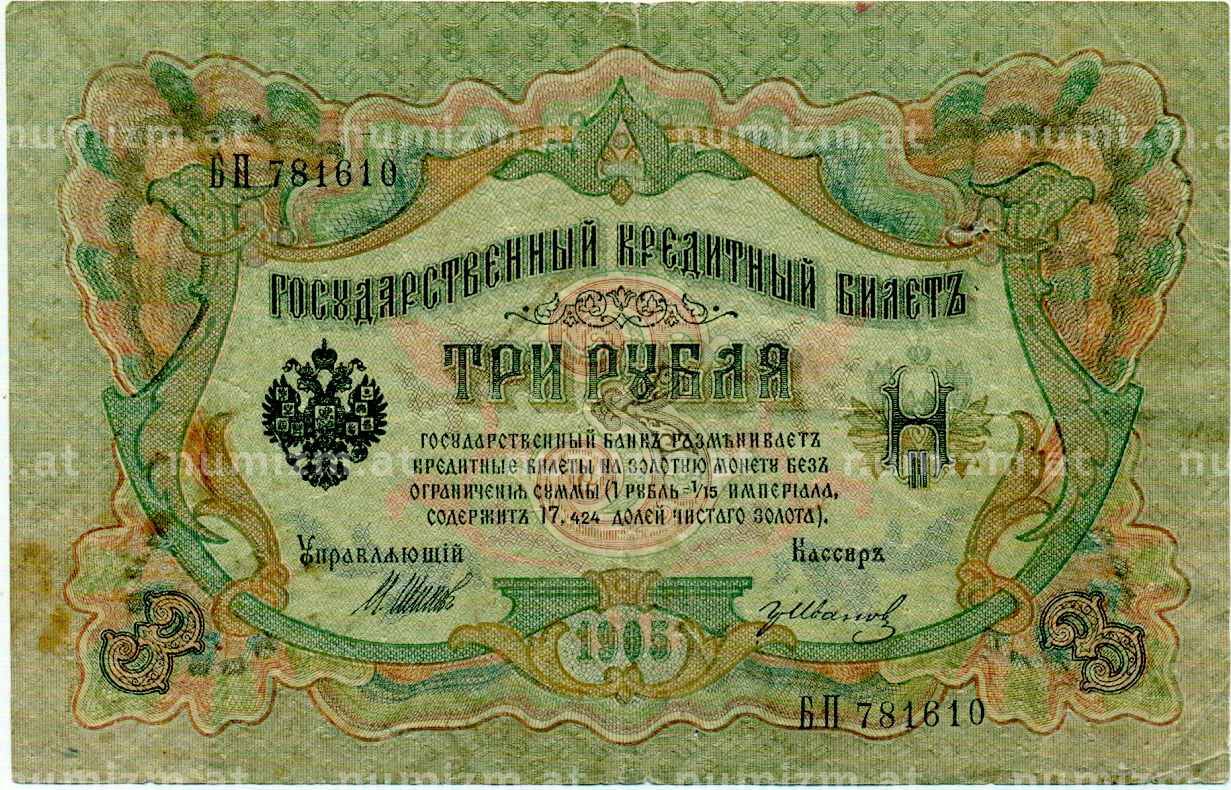 Банкнота 3 рубля 1905 года Шипов / Иванов (Артикул: K10-8043): подробные характеристики, качественные фотографии в высоком разрешении, низкая цена.