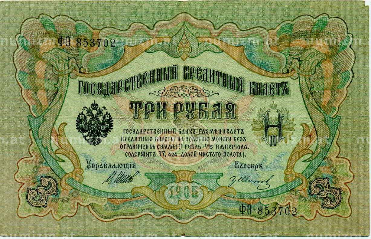 Банкнота 3 рубля 1905 года Шипов / Иванов (Артикул: K10-8045): подробные характеристики, качественные фотографии в высоком разрешении, низкая цена.