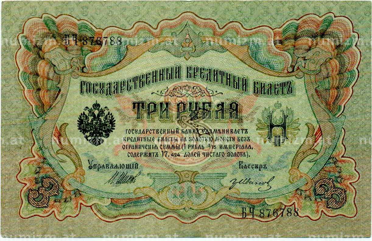 Банкнота 3 рубля 1905 года Шипов / Иванов (Артикул: K10-8050): подробные характеристики, качественные фотографии в высоком разрешении, низкая цена.