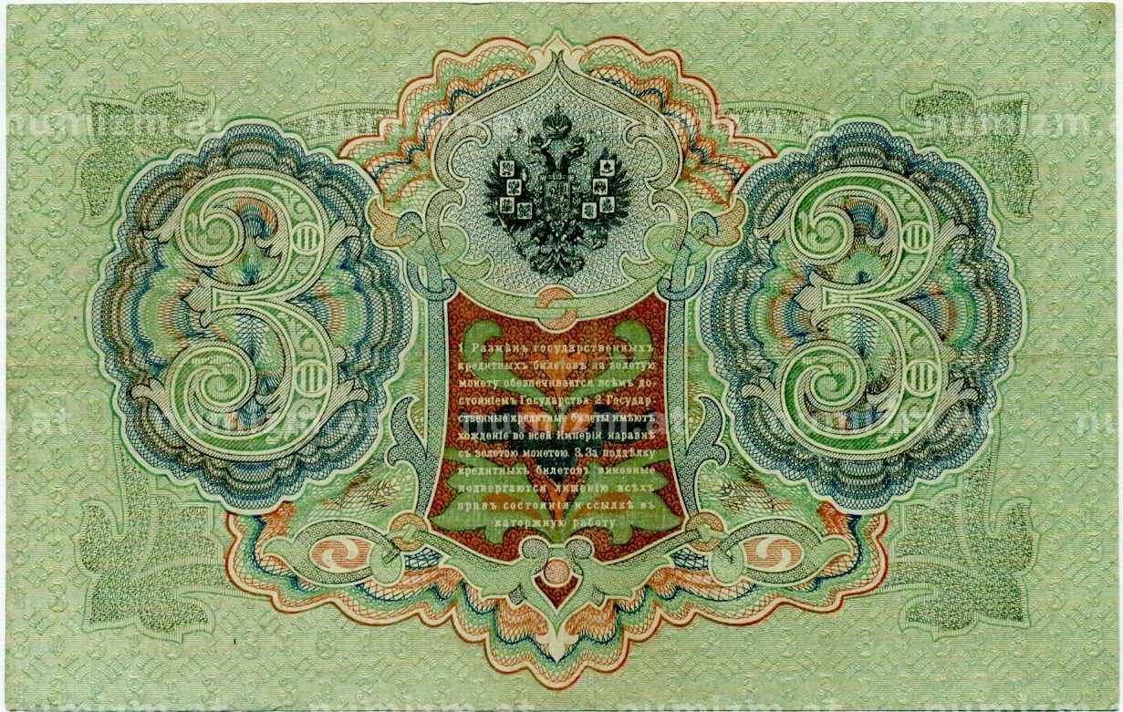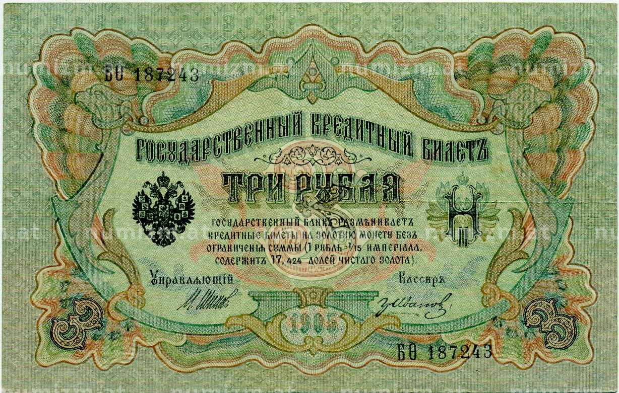 Банкнота 3 рубля 1905 года Шипов / Иванов (Артикул: K10-8051): подробные характеристики, качественные фотографии в высоком разрешении, низкая цена.