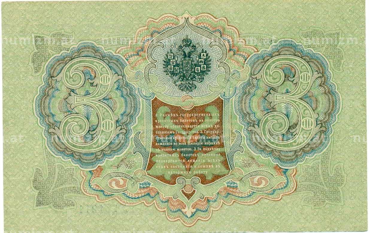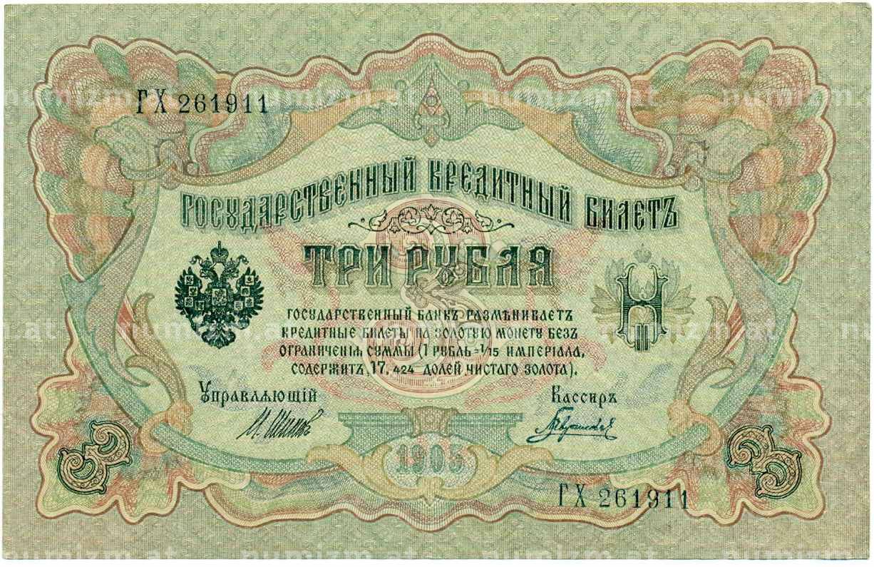 Банкнота 3 рубля 1905 года Шипов / Гаврилов (Артикул: K10-8063): подробные характеристики, качественные фотографии в высоком разрешении, низкая цена.