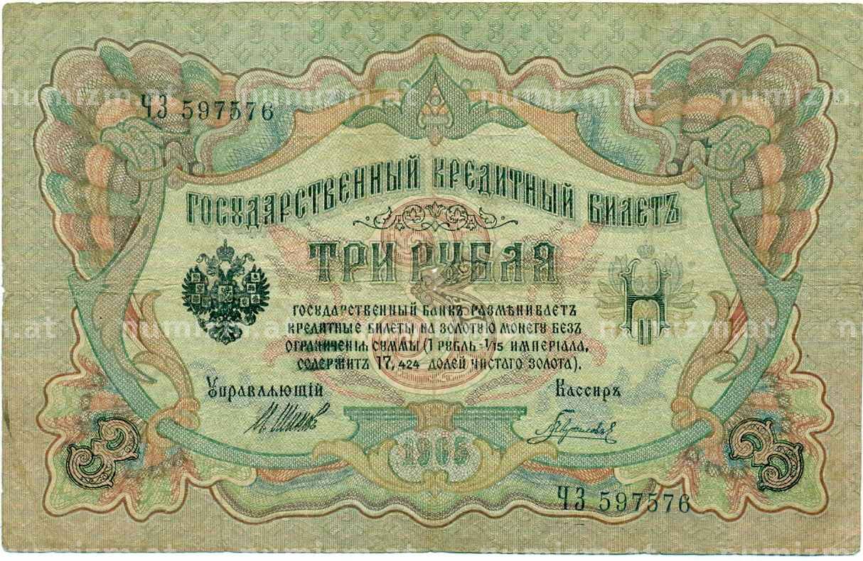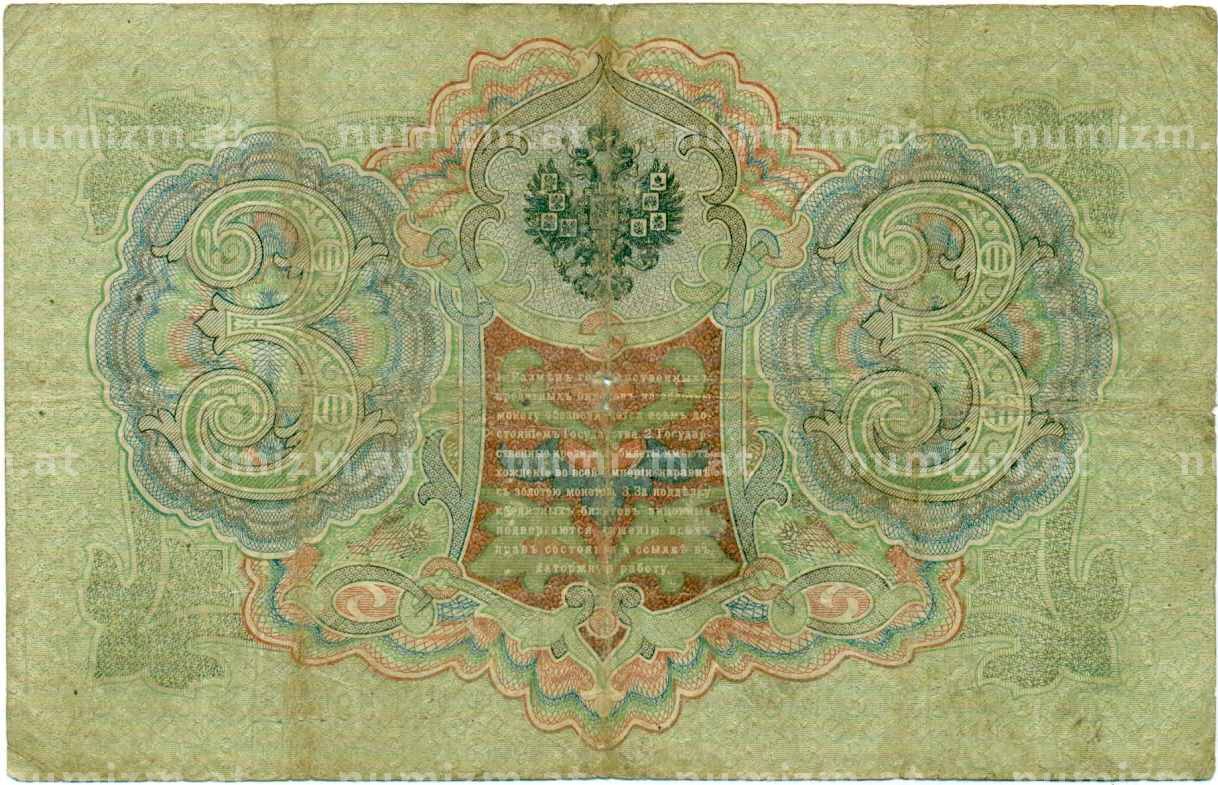 Банкнота 3 рубля 1905 года Шипов / Гаврилов (Артикул: K10-8065): подробные характеристики, качественные фотографии в высоком разрешении, низкая цена.
