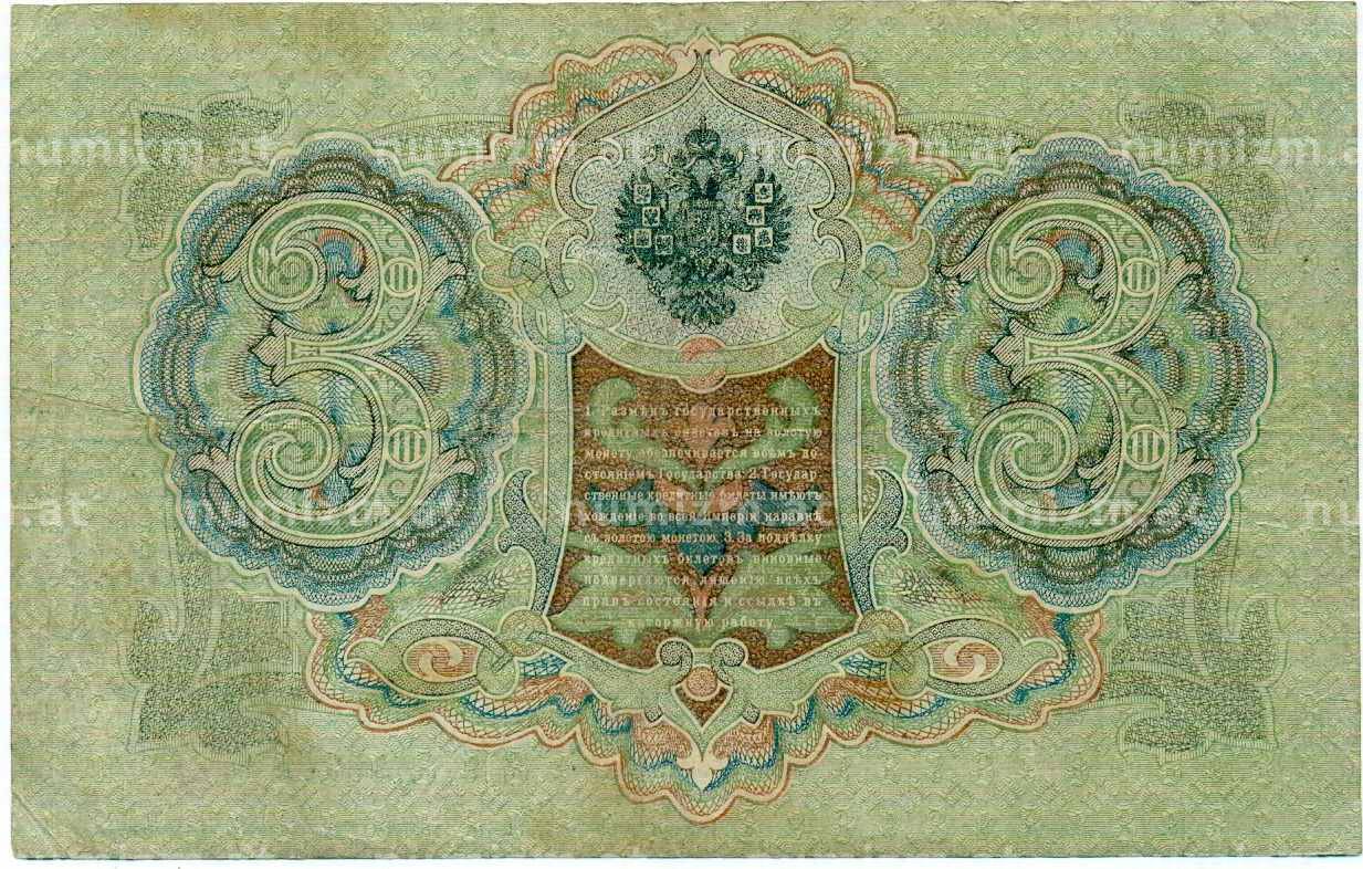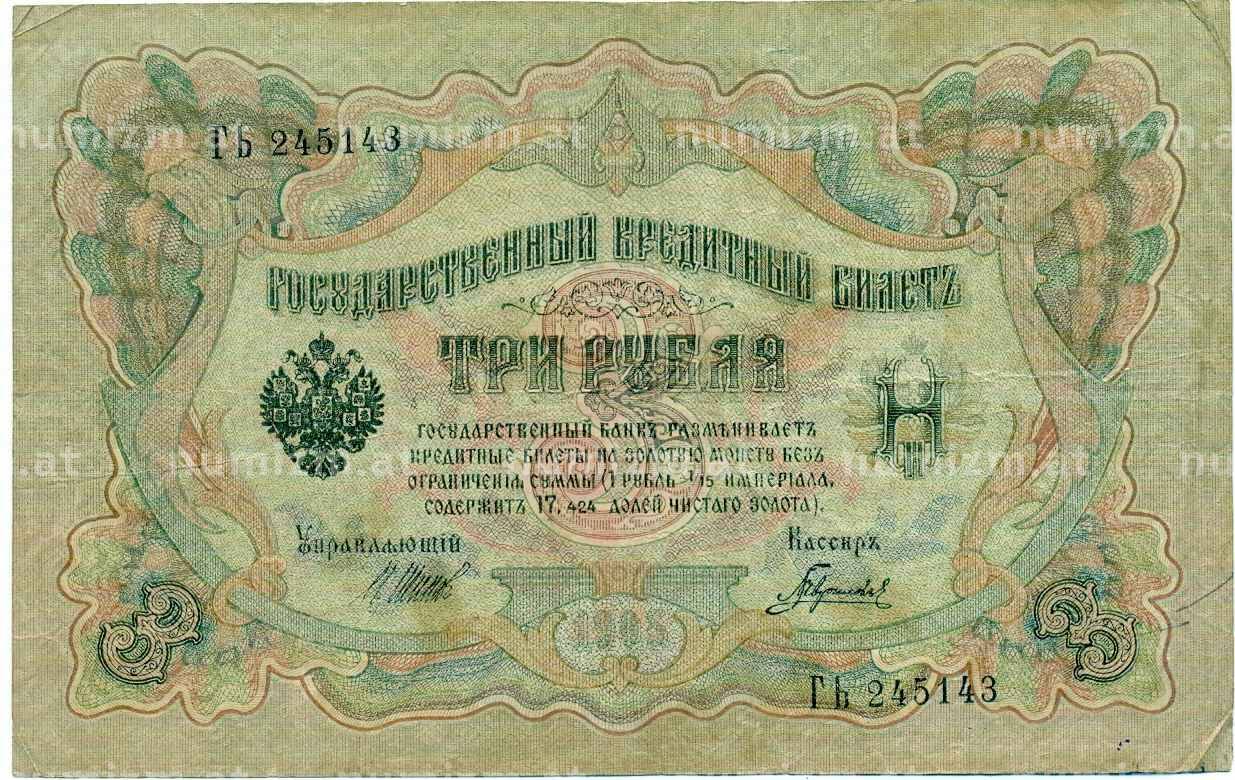 Банкнота 3 рубля 1905 года Шипов / Гаврилов (Артикул: K10-8071): подробные характеристики, качественные фотографии в высоком разрешении, низкая цена.