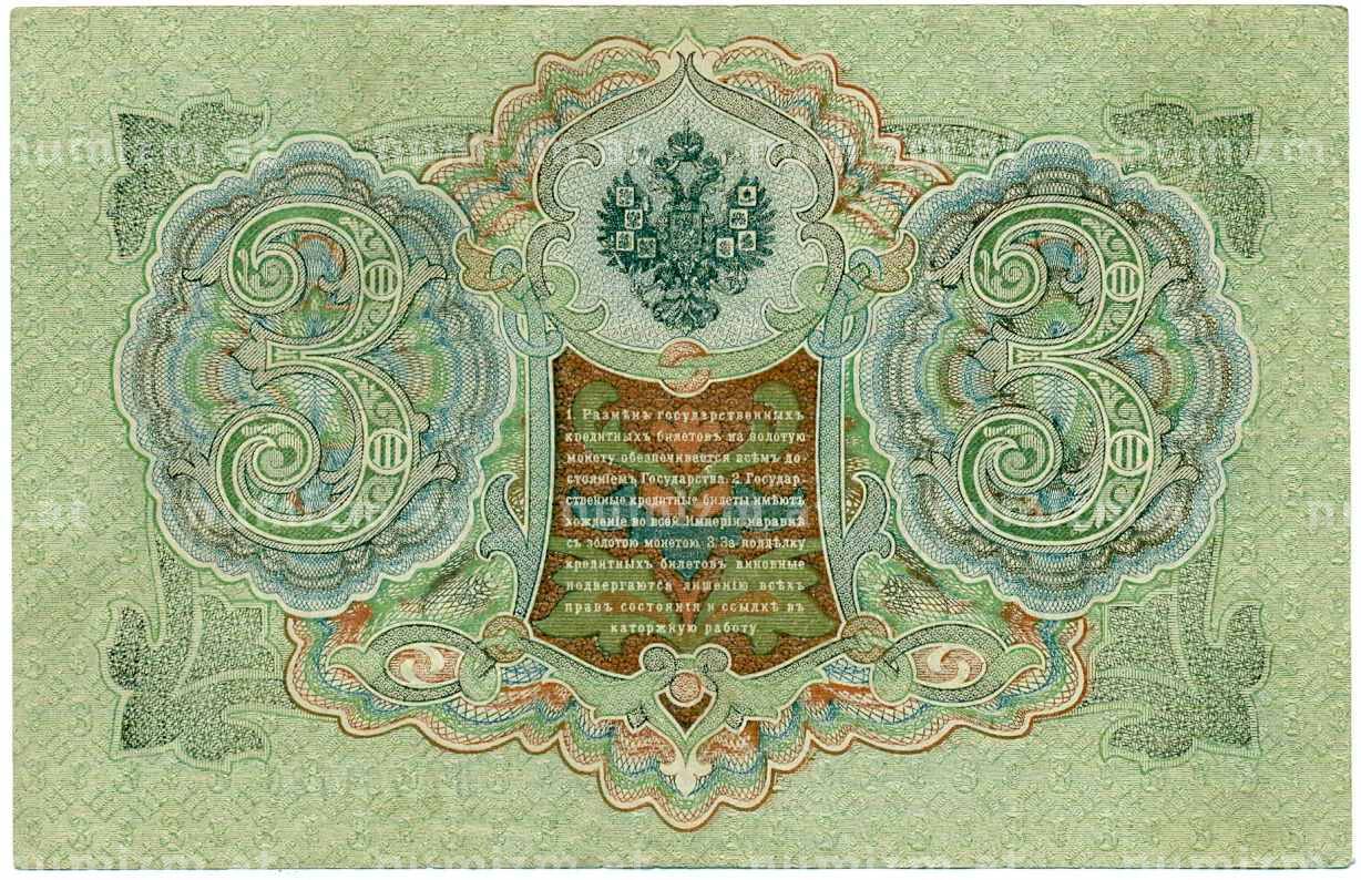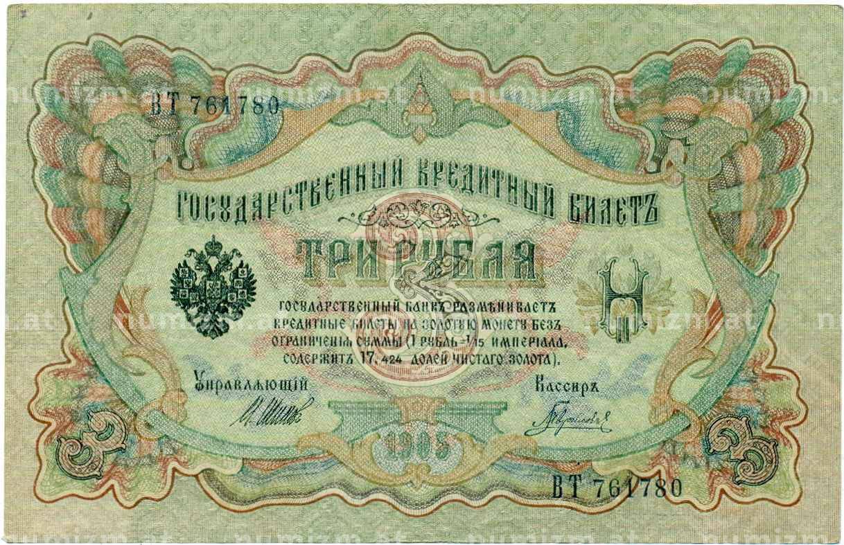 Банкнота 3 рубля 1905 года Шипов / Гаврилов (Артикул: K10-8075): подробные характеристики, качественные фотографии в высоком разрешении, низкая цена.