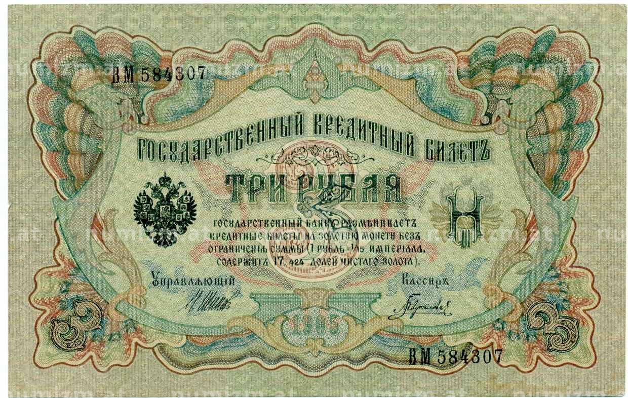 Банкнота 3 рубля 1905 года Шипов / Гаврилов (Артикул: K10-8081): подробные характеристики, качественные фотографии в высоком разрешении, низкая цена.
