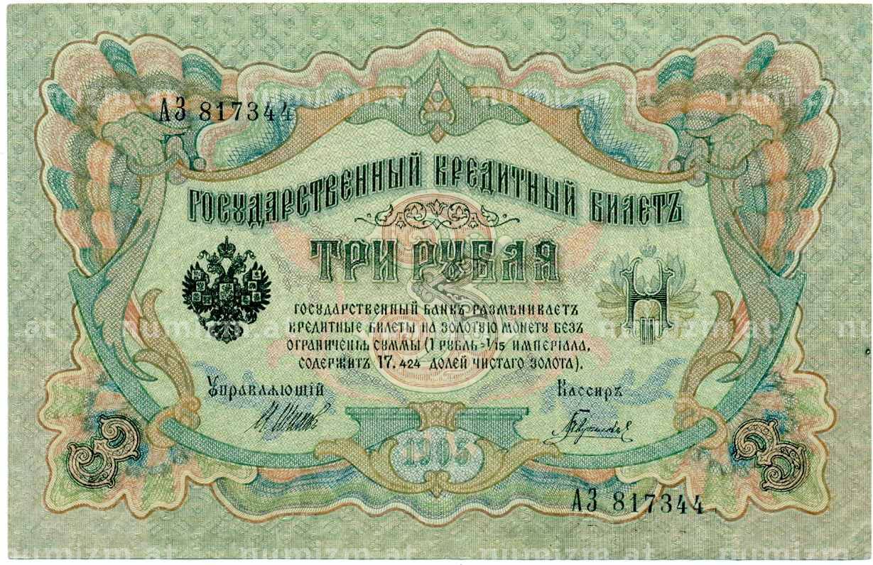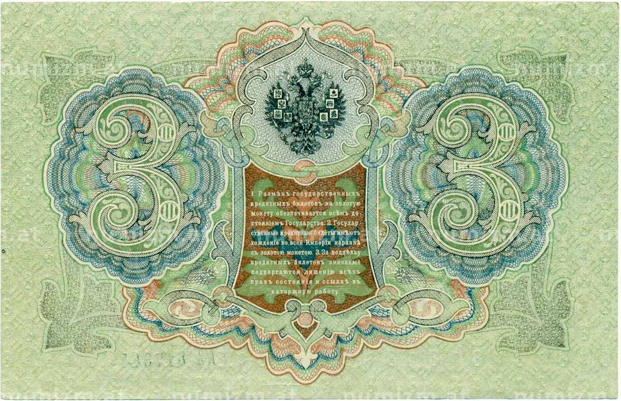 Банкнота 3 рубля 1905 года Шипов / Гаврилов (Артикул: K10-8082): подробные характеристики, качественные фотографии в высоком разрешении, низкая цена.