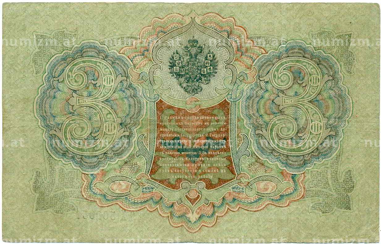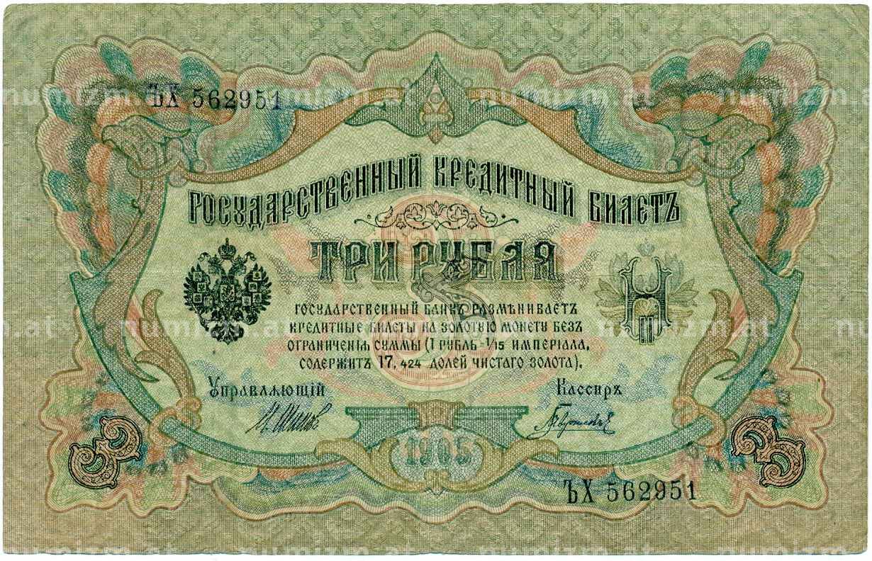 Банкнота 3 рубля 1905 года Шипов / Гаврилов (Артикул: K10-8086): подробные характеристики, качественные фотографии в высоком разрешении, низкая цена.