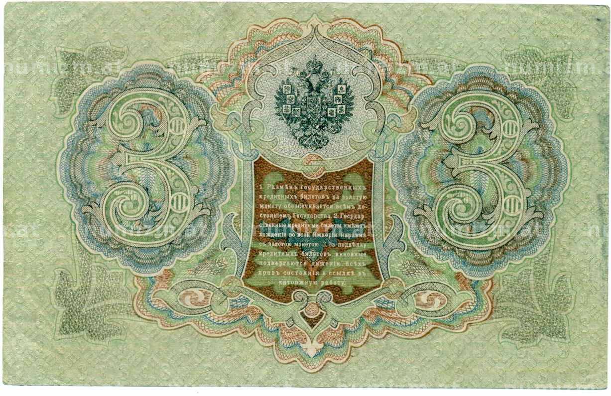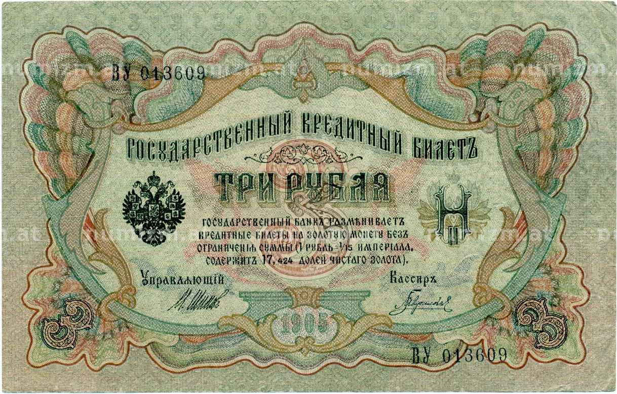 Банкнота 3 рубля 1905 года Шипов / Гаврилов (Артикул: K10-8094): подробные характеристики, качественные фотографии в высоком разрешении, низкая цена.