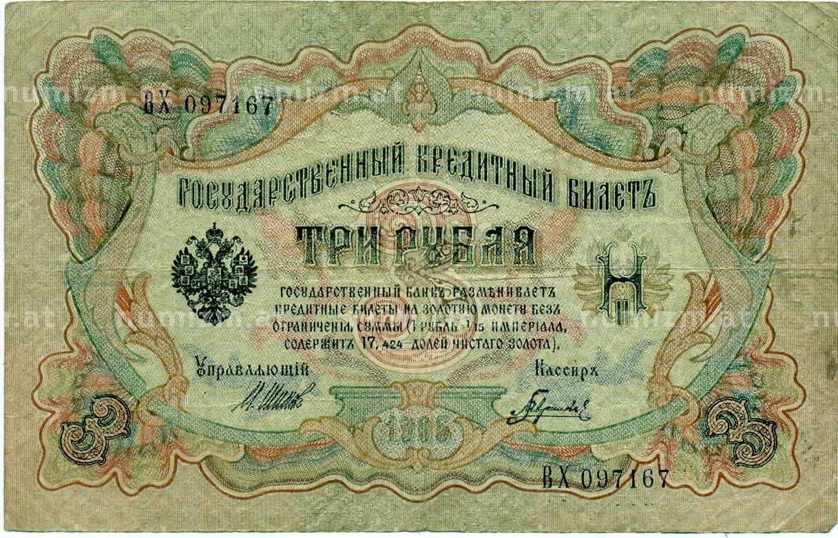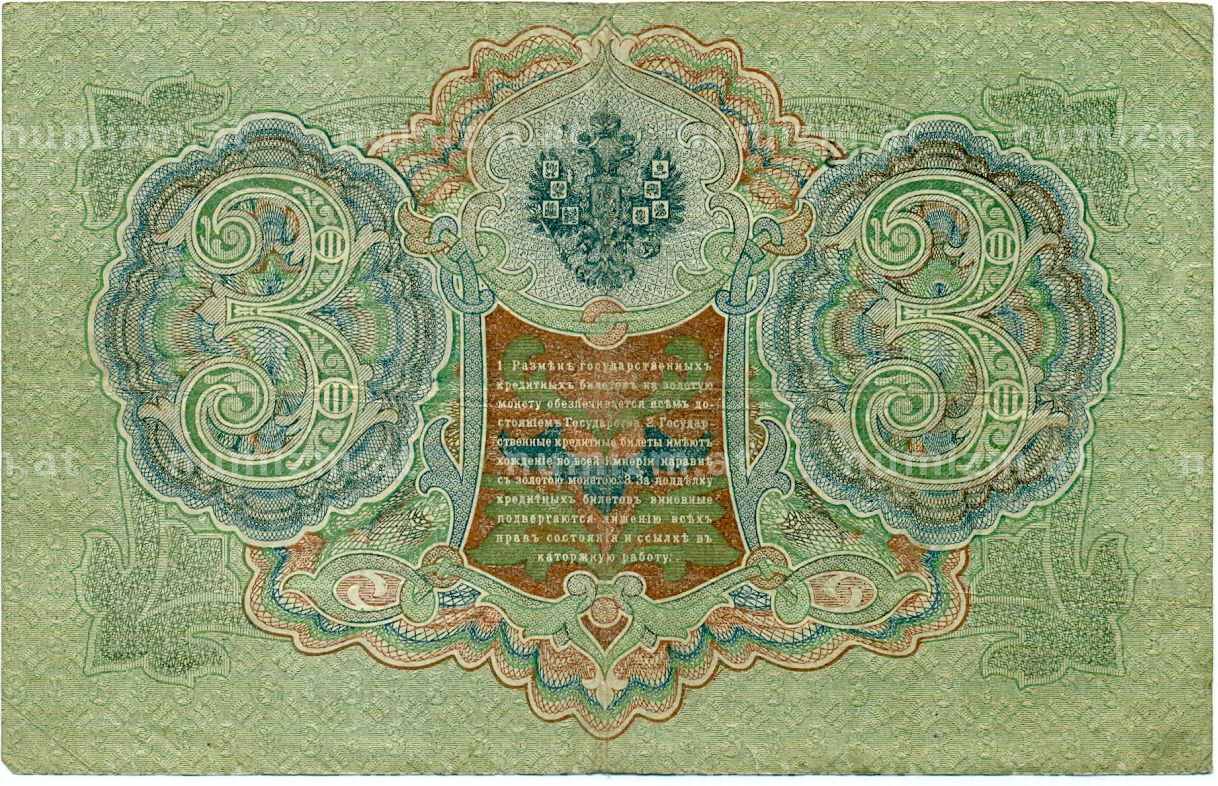 Банкнота 3 рубля 1905 года Шипов / Гаврилов (Артикул: K10-8095): подробные характеристики, качественные фотографии в высоком разрешении, низкая цена.