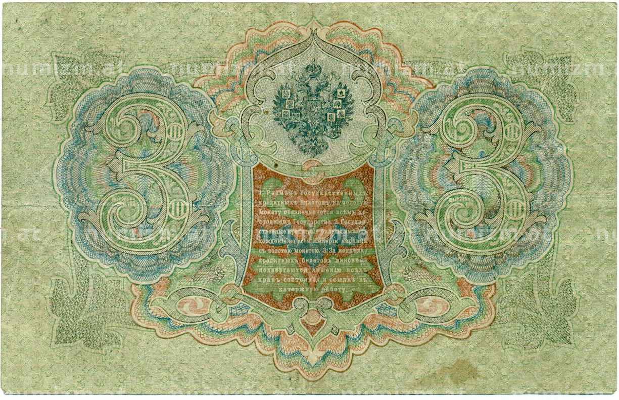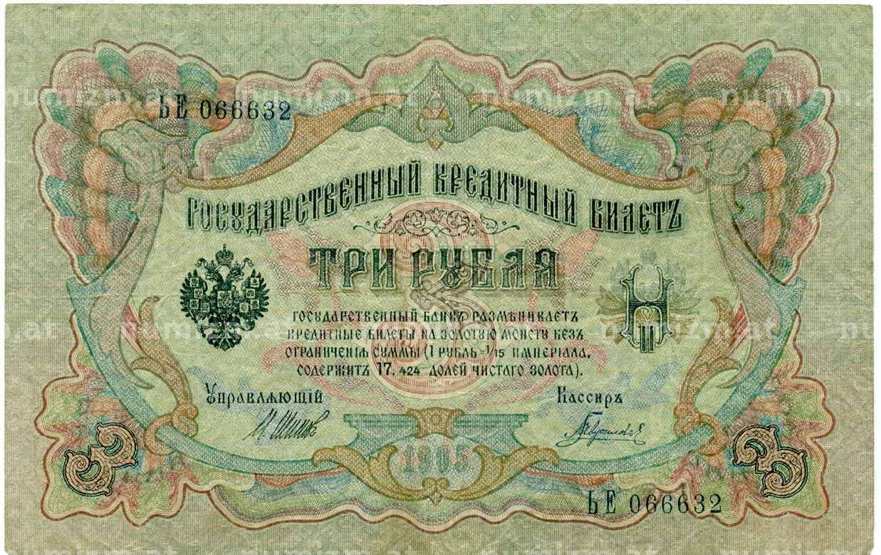 Банкнота 3 рубля 1905 года Шипов / Гаврилов (Артикул: K10-8097): подробные характеристики, качественные фотографии в высоком разрешении, низкая цена.