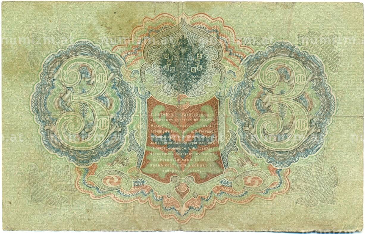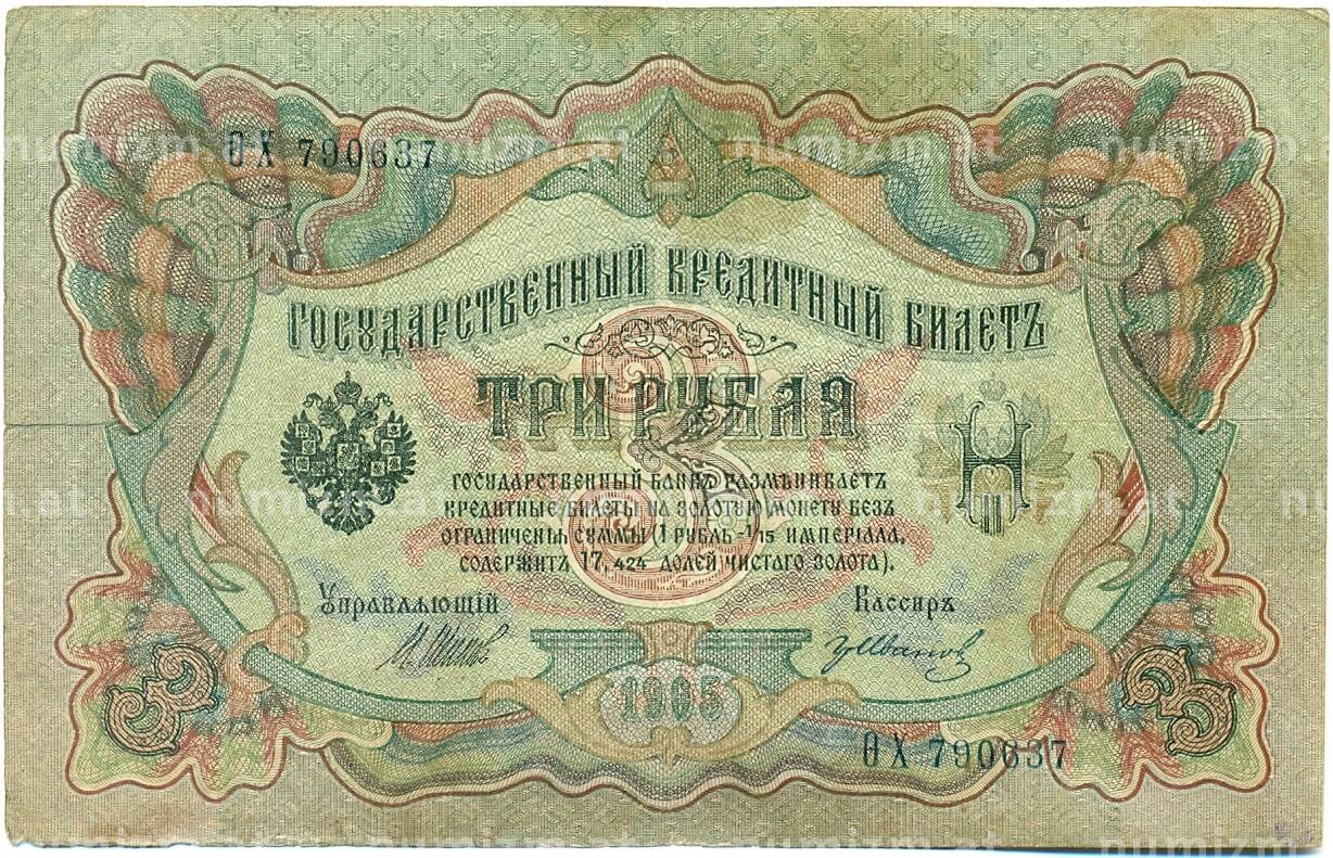 Банкнота 3 рубля 1905 года Шипов / Иванов (Артикул: K10-8129): подробные характеристики, качественные фотографии в высоком разрешении, низкая цена.
