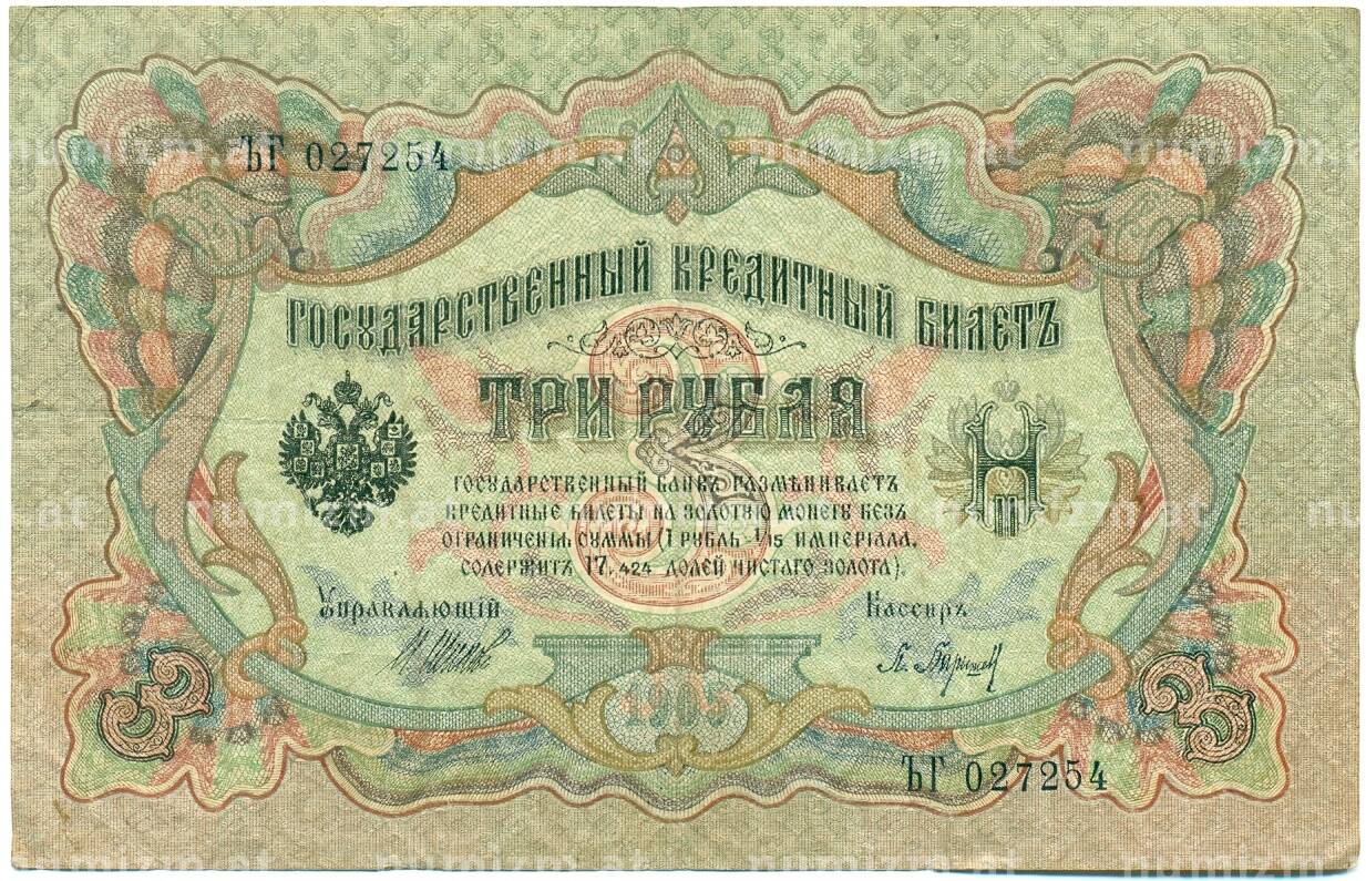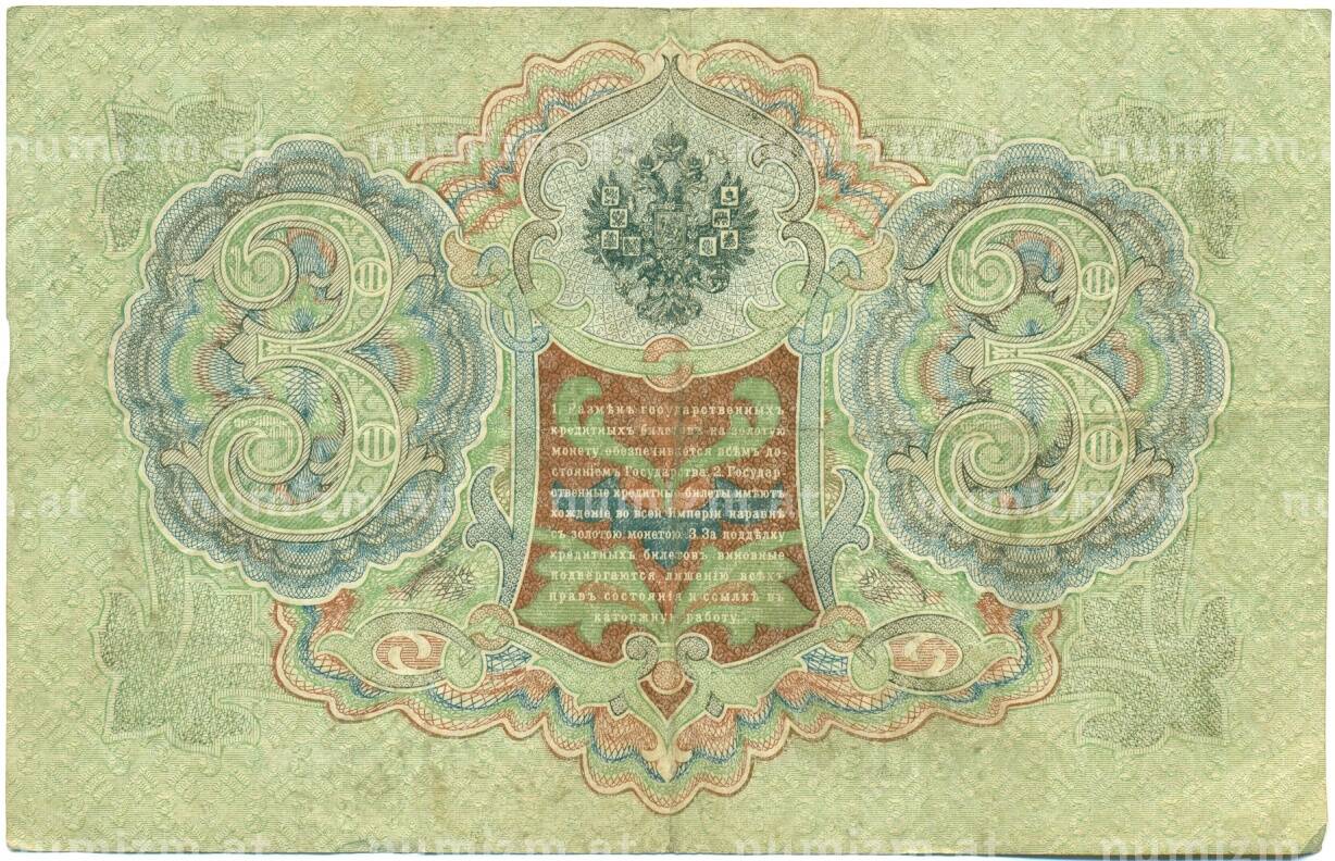 Банкнота 3 рубля 1905 года Шипов / Барышев (Артикул: K10-8151): подробные характеристики, качественные фотографии в высоком разрешении, низкая цена.
