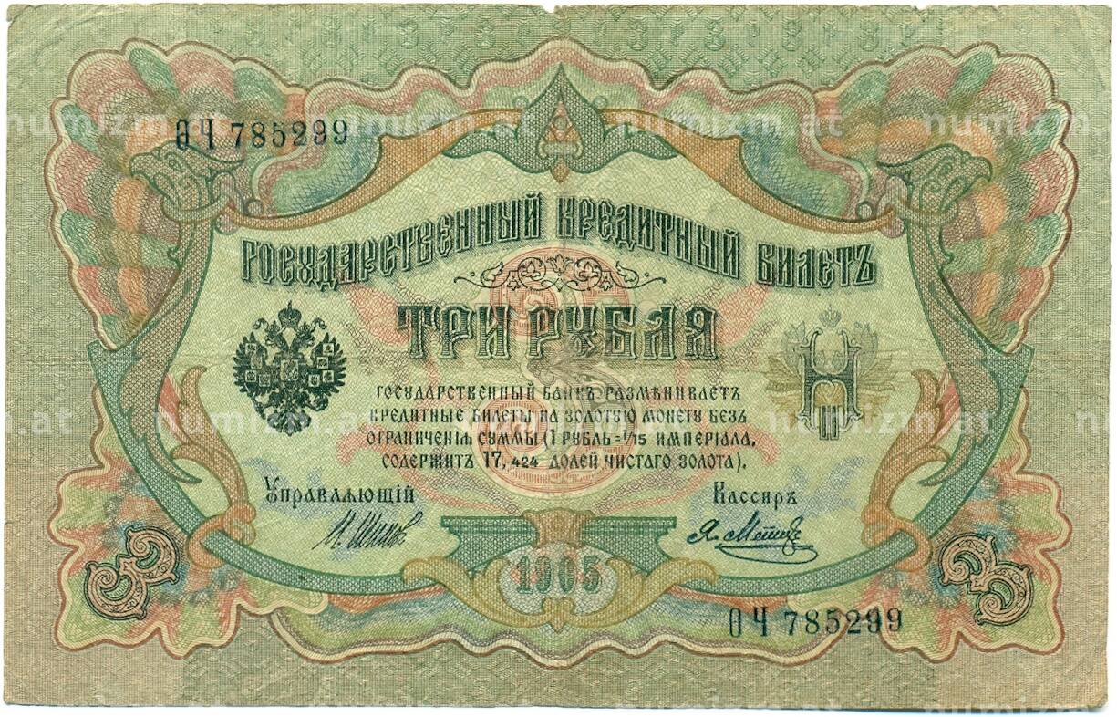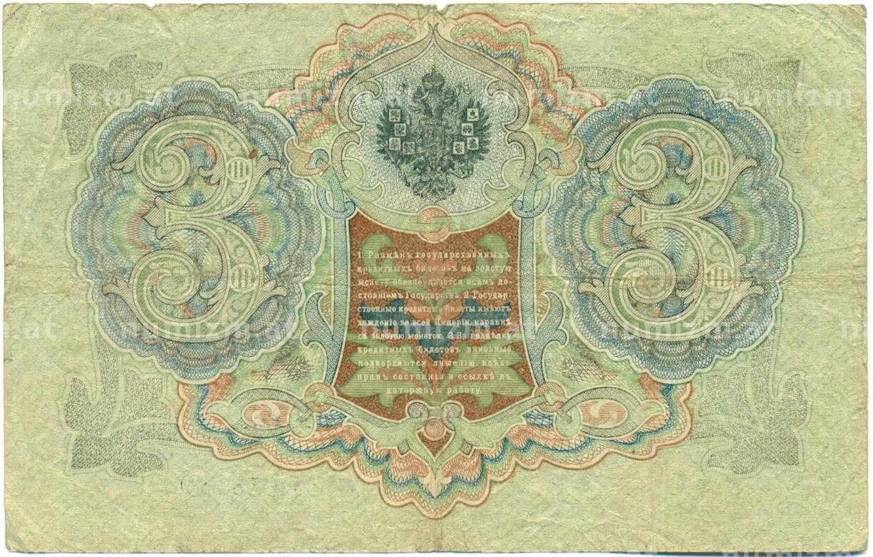 Банкнота 3 рубля 1905 года Шипов / Метц (Артикул: K10-8179): подробные характеристики, качественные фотографии в высоком разрешении, низкая цена.