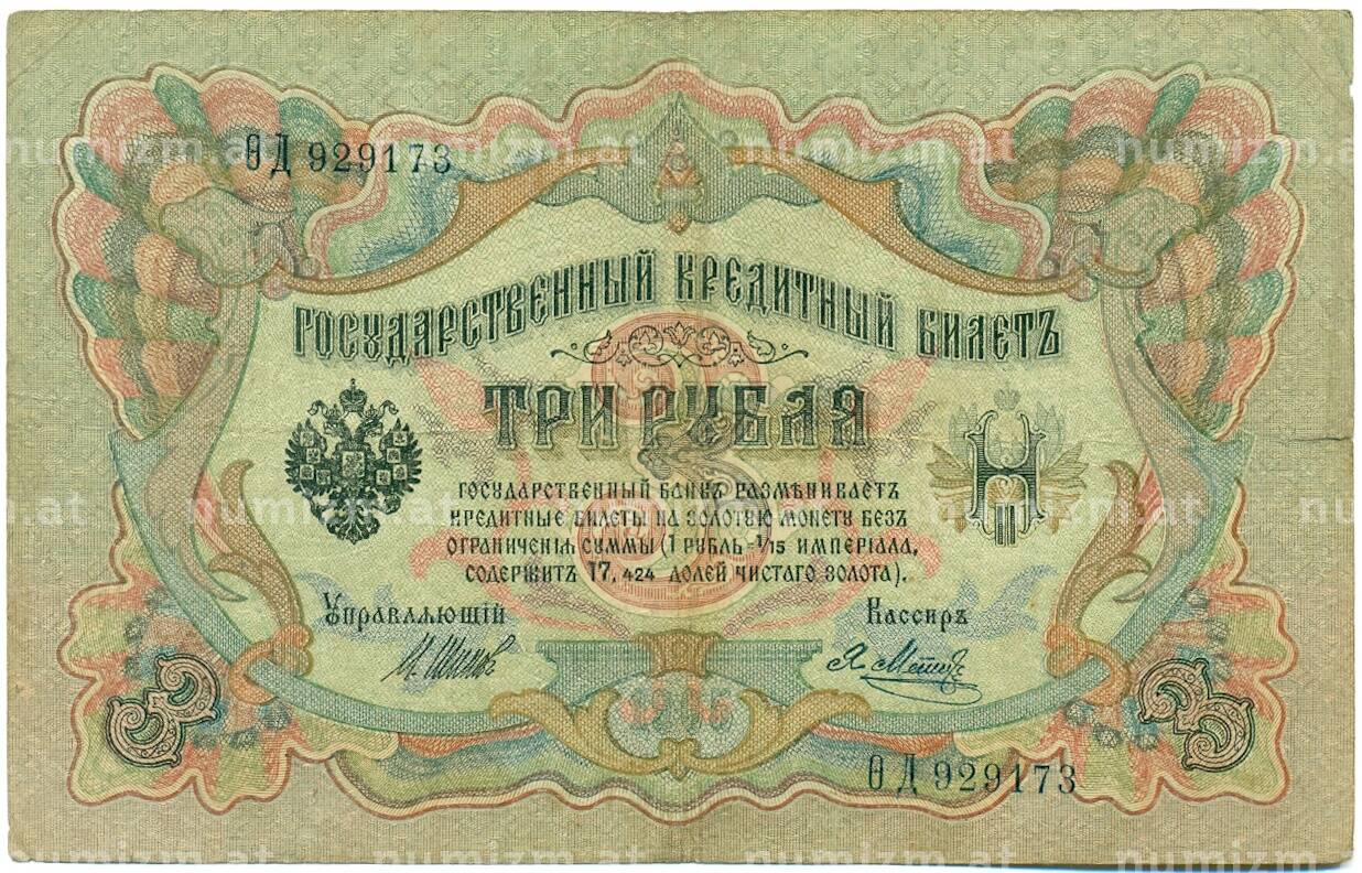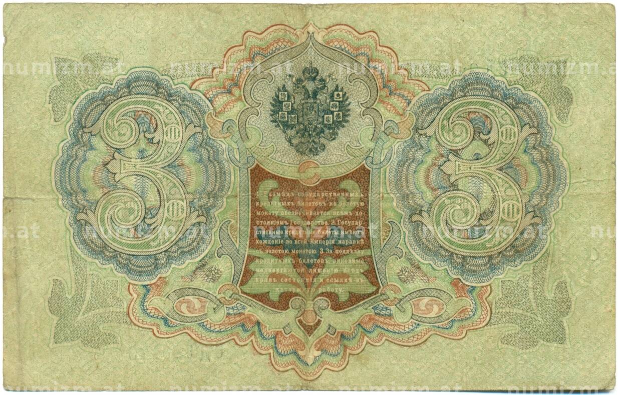 Банкнота 3 рубля 1905 года Шипов / Метц (Артикул: K10-8199): подробные характеристики, качественные фотографии в высоком разрешении, низкая цена.