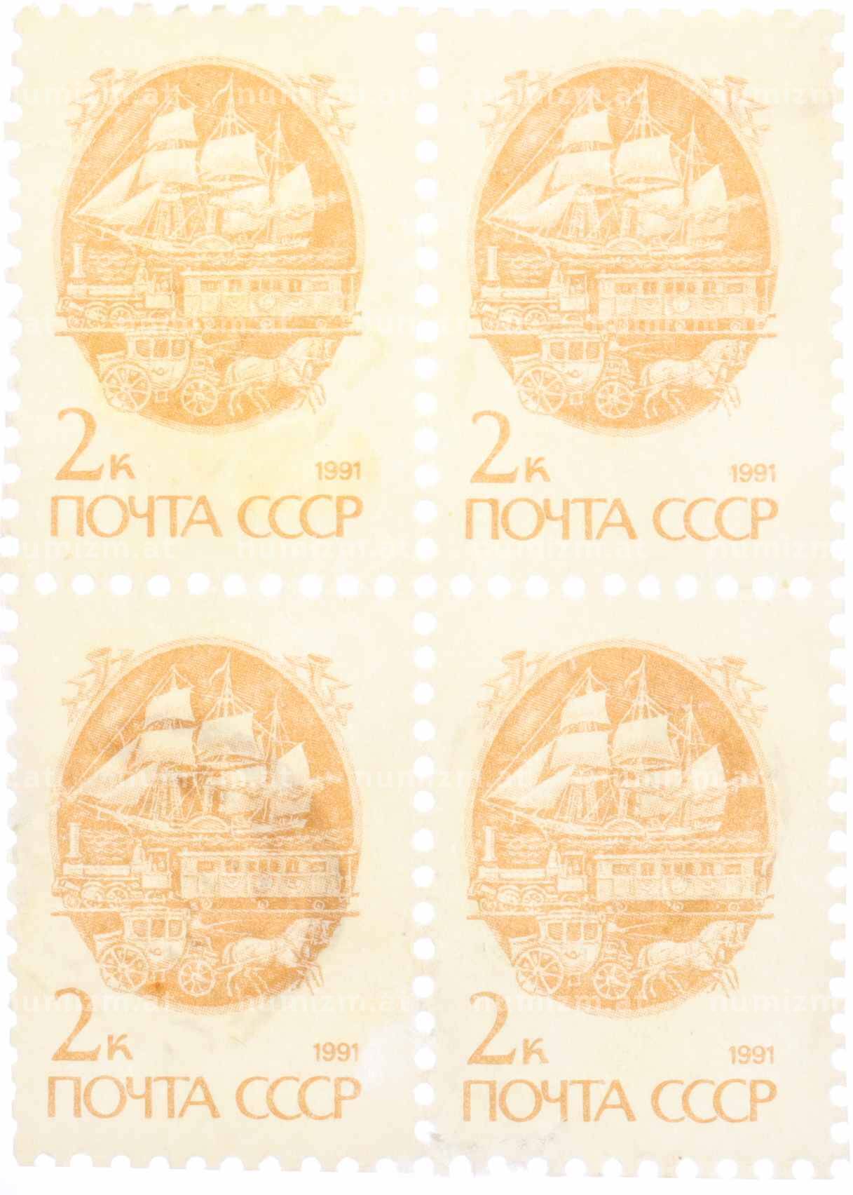 Сцепка из 4 марок 2 копейки 1991 года «Стандартный выпуск — Средства доставки почты XIX века» (Артикул: K10-8719): подробные характеристики, качественные фотографии в высоком разрешении, низкая цена.