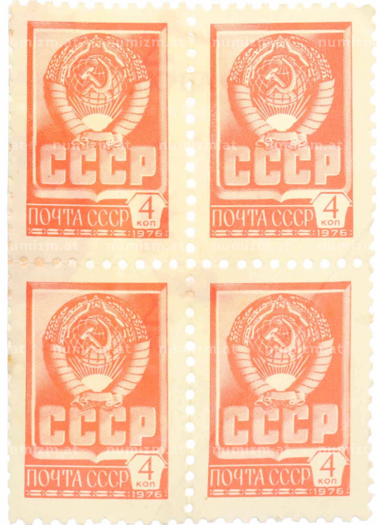 Сцепка из 4 марок 4 копейки 1976 года «Стандартный выпуск — Государственный герб СССР» (Артикул: K10-8720): подробные характеристики, качественные фотографии в высоком разрешении, низкая цена.