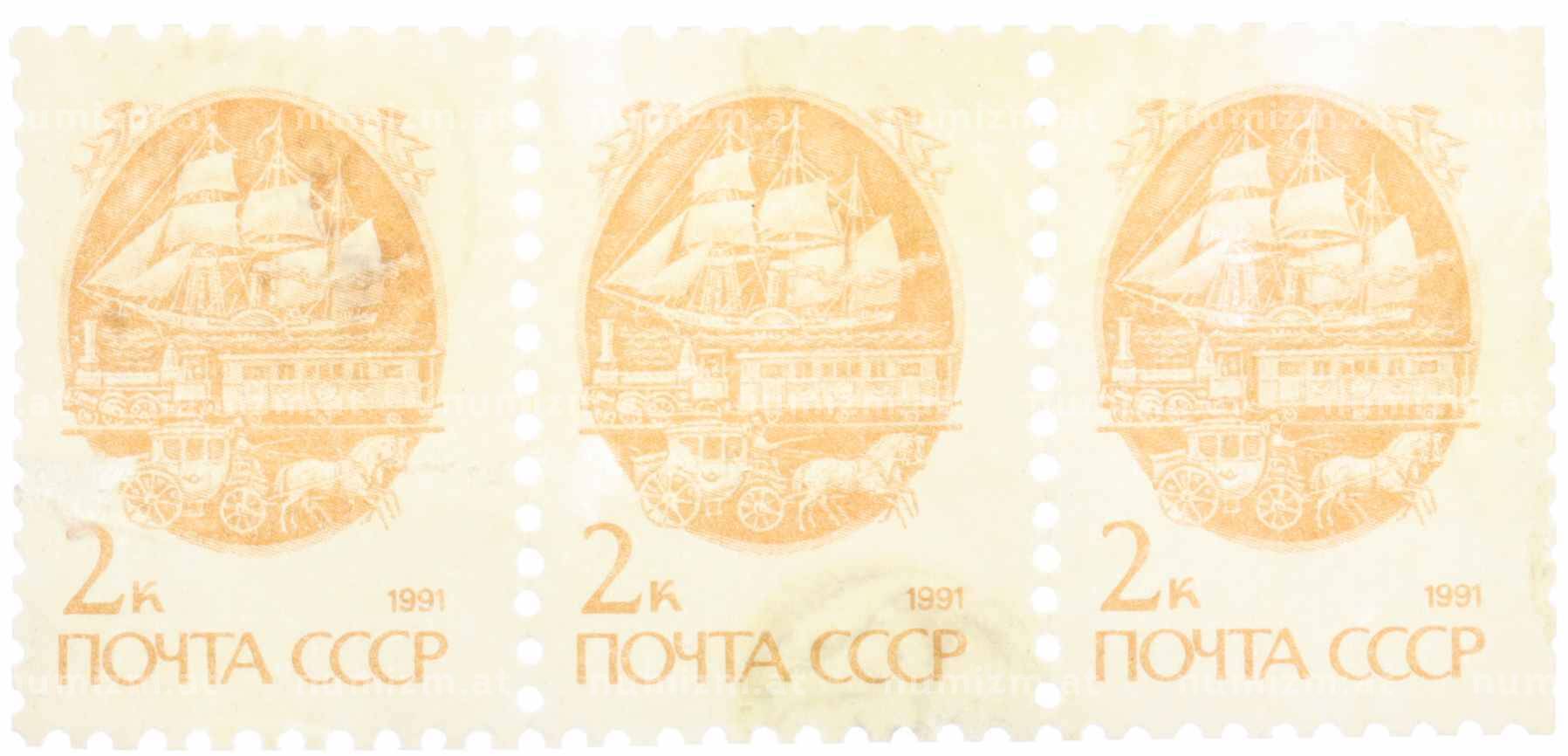 Сцепка из 3 марок 2 копейки 1991 года «Стандартный выпуск — Средства доставки почты XIX века» (Артикул: K10-8723): подробные характеристики, качественные фотографии в высоком разрешении, низкая цена.
