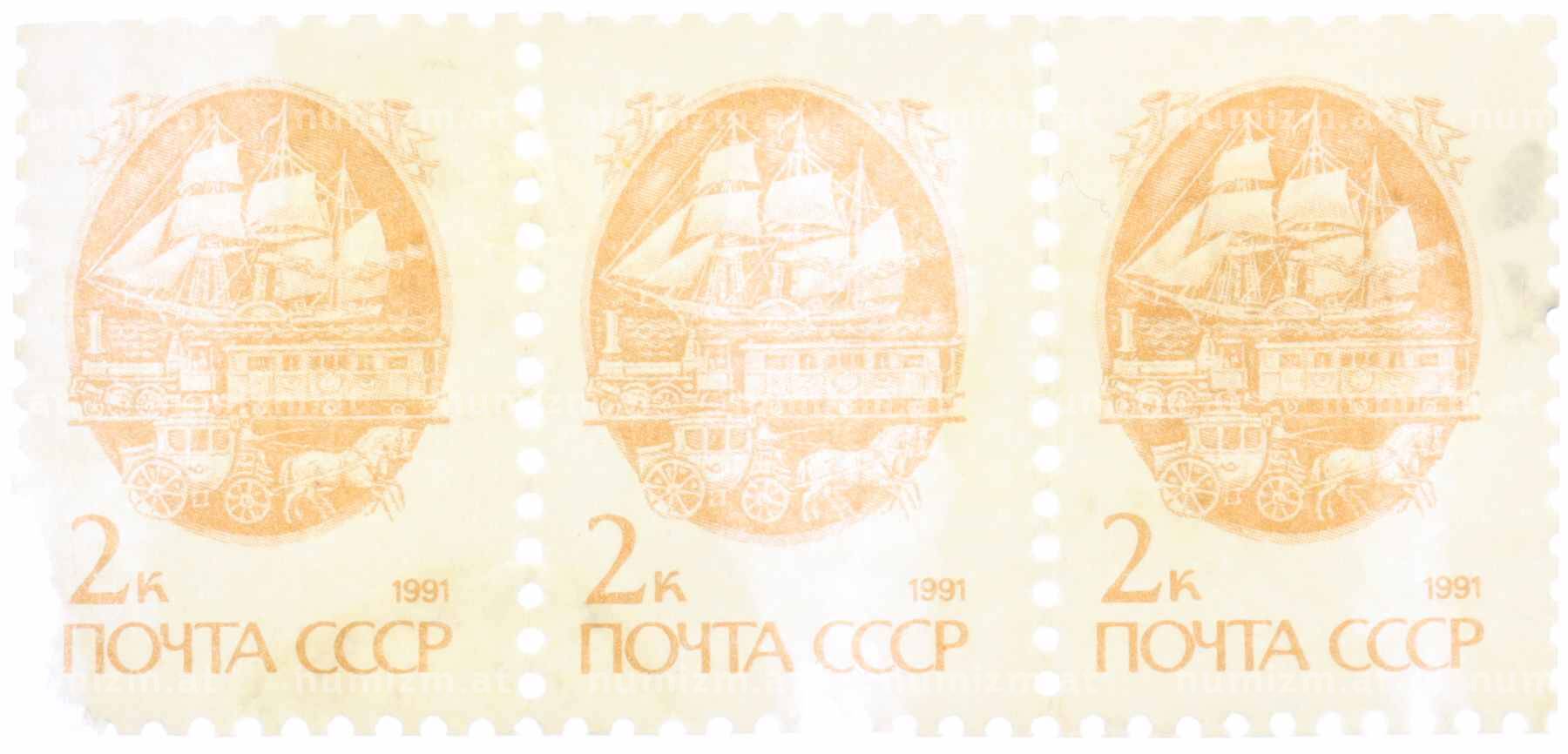 Сцепка из 3 марок 2 копейки 1991 года «Стандартный выпуск — Средства доставки почты XIX века» (Артикул: K10-8727): подробные характеристики, качественные фотографии в высоком разрешении, низкая цена.
