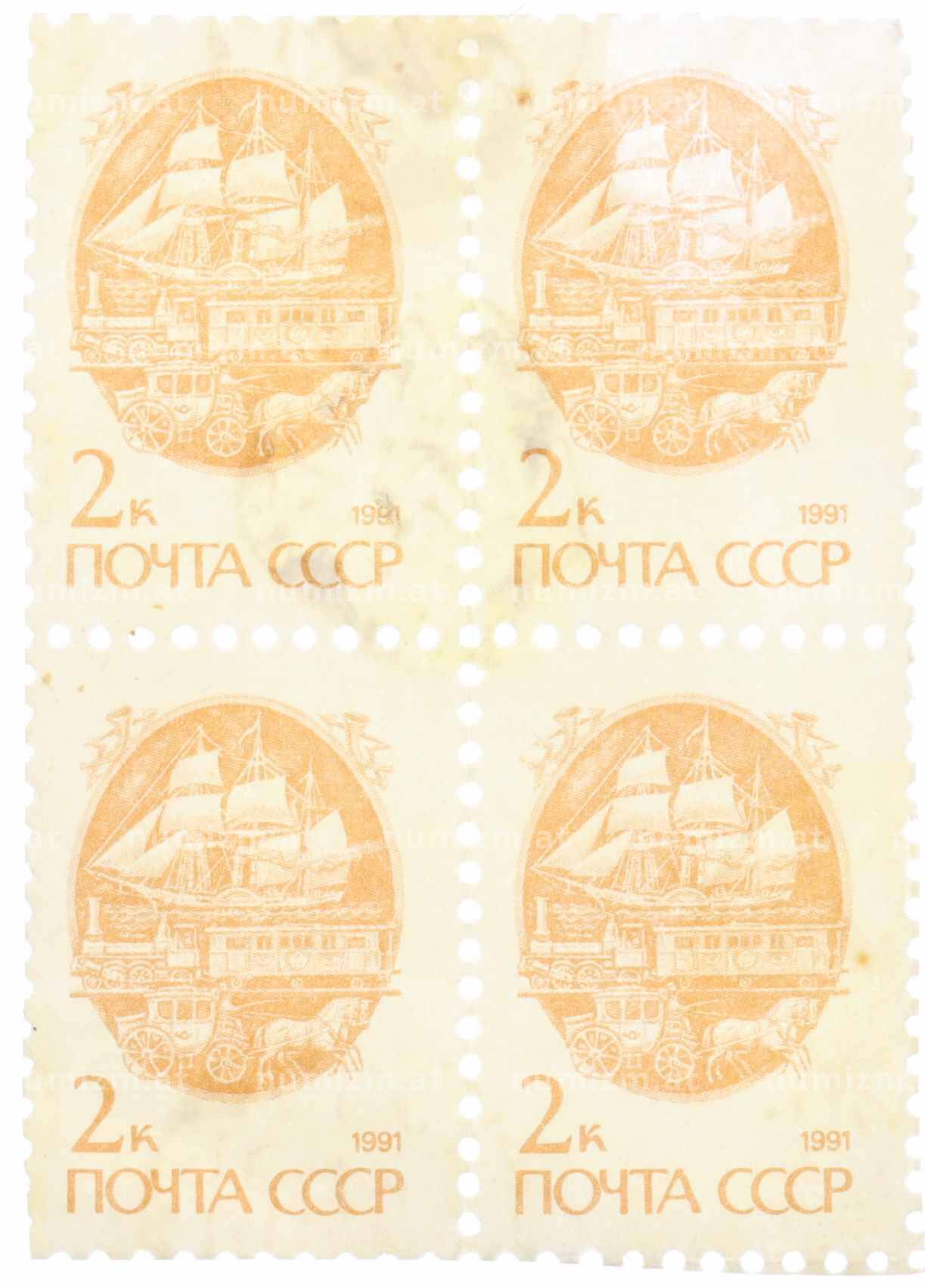 Сцепка из 4 марок 2 копейки 1991 года «Стандартный выпуск — Средства доставки почты XIX века» [Артикул: K10-8735]