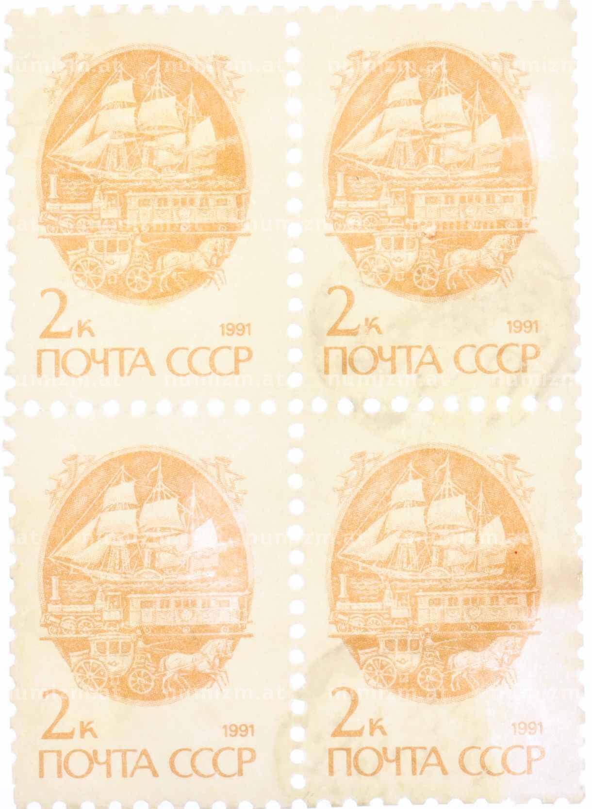 Сцепка из 4 марок 2 копейки 1991 года «Стандартный выпуск — Средства доставки почты XIX века» (Артикул: K10-8823): подробные характеристики, качественные фотографии в высоком разрешении, низкая цена.