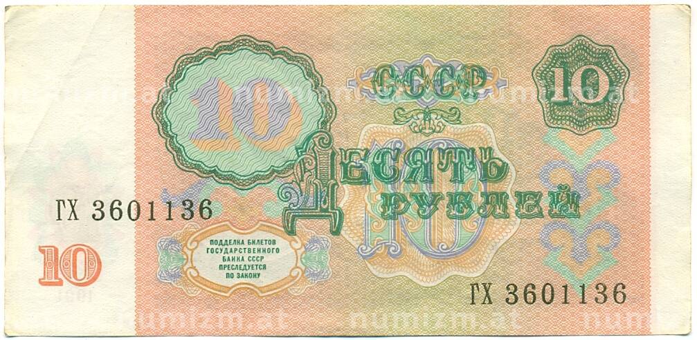 • Банкнота 10 рублей 1991 года (Артикул: K10-9144) — Фото №1 Банкнота 10 рублей 1991 года (Артикул: K10-9144) — Фото №2