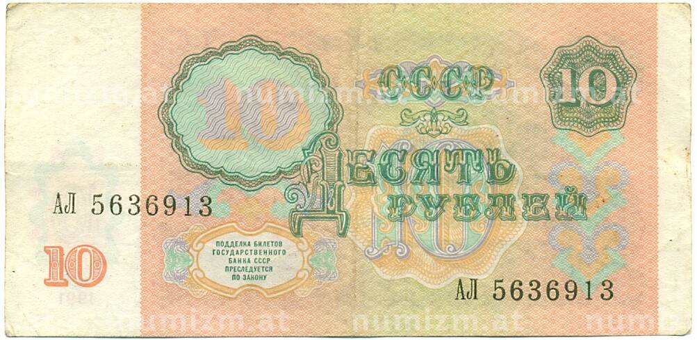 • Банкнота 10 рублей 1991 года (Артикул: K10-9147) — Фото №1 Банкнота 10 рублей 1991 года (Артикул: K10-9147) — Фото №2