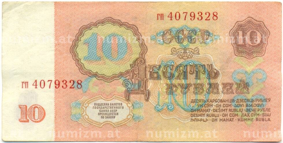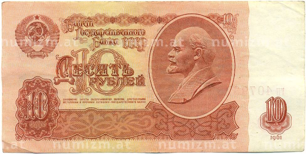• Банкнота 10 рублей 1961 года (Артикул: K10-9154) — Фото №1 Банкнота 10 рублей 1961 года (Артикул: K10-9154) — Фото №2
