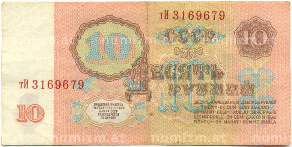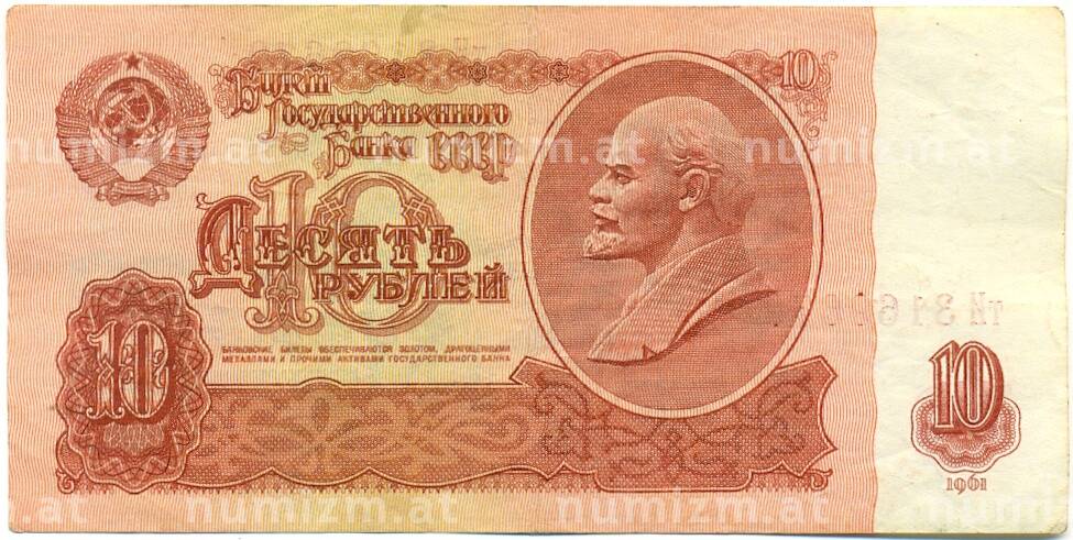 • Банкнота 10 рублей 1961 года (Артикул: K10-9158) — Фото №1 Банкнота 10 рублей 1961 года (Артикул: K10-9158) — Фото №2