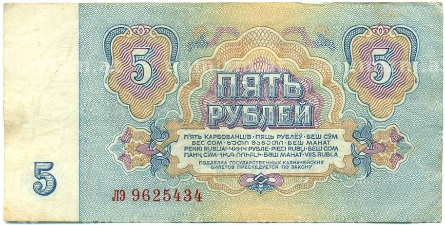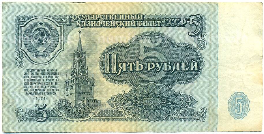 • Банкнота 5 рублей 1961 года (Артикул: K10-9166) — Фото №1 Банкнота 5 рублей 1961 года (Артикул: K10-9166) — Фото №2