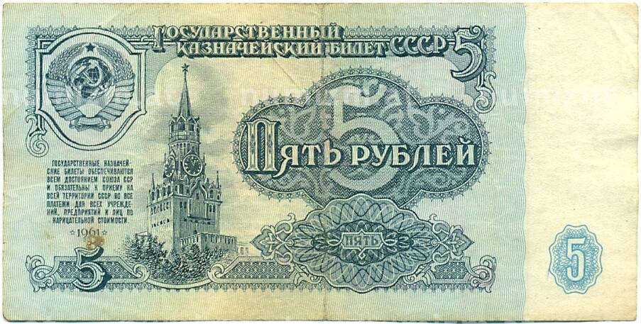 Банкнота 5 рублей 1961 года (Артикул: K10-9172): подробные характеристики, качественные фотографии в высоком разрешении, низкая цена.