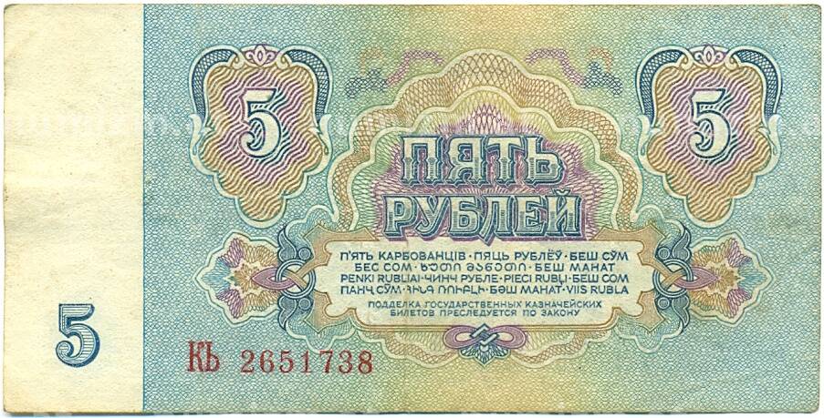 • Банкнота 5 рублей 1961 года (Артикул: K10-9172) — Фото №1 Банкнота 5 рублей 1961 года (Артикул: K10-9172) — Фото №2