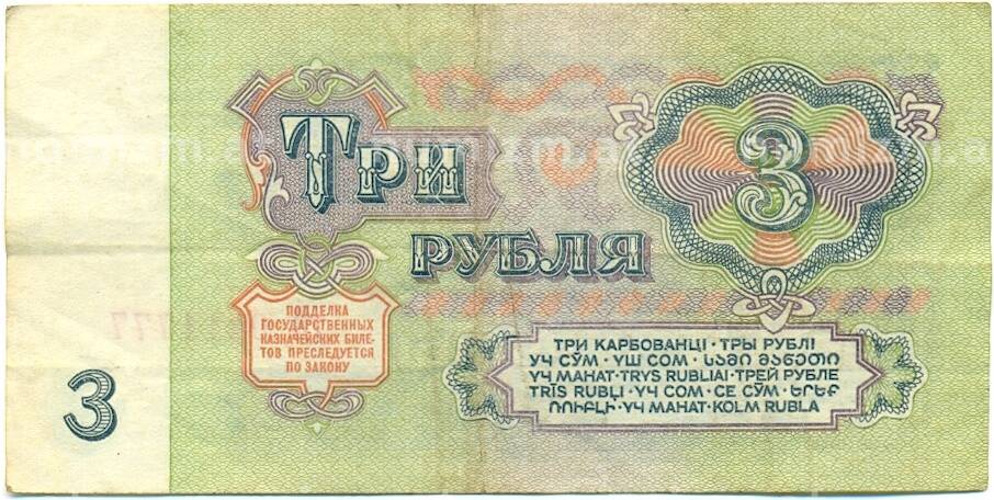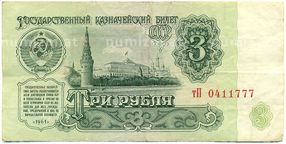Банкнота 3 рубля 1961 года (Артикул: K10-9184): подробные характеристики, качественные фотографии в высоком разрешении, низкая цена.