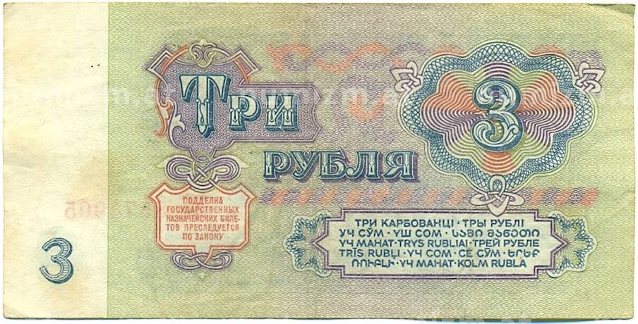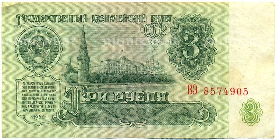 Банкнота 3 рубля 1961 года (Артикул: K10-9189): подробные характеристики, качественные фотографии в высоком разрешении, низкая цена.