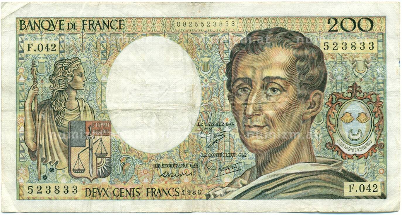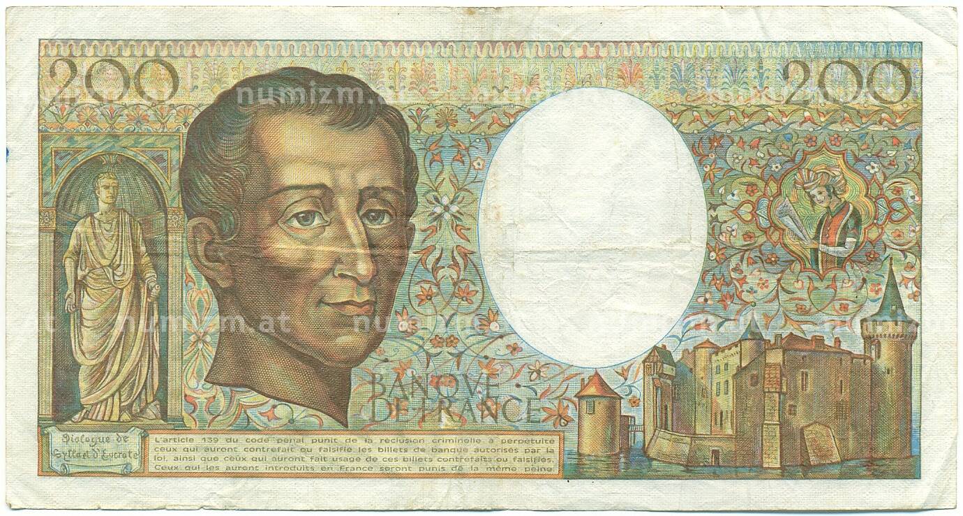 Банкнота 200 франков 1986 года Франция (Артикул: K10-9399): подробные характеристики, качественные фотографии в высоком разрешении, низкая цена.