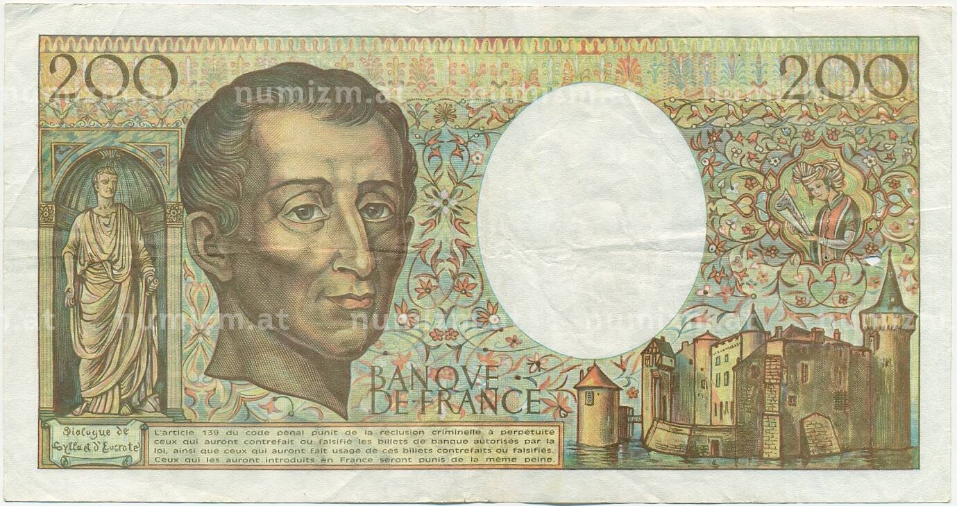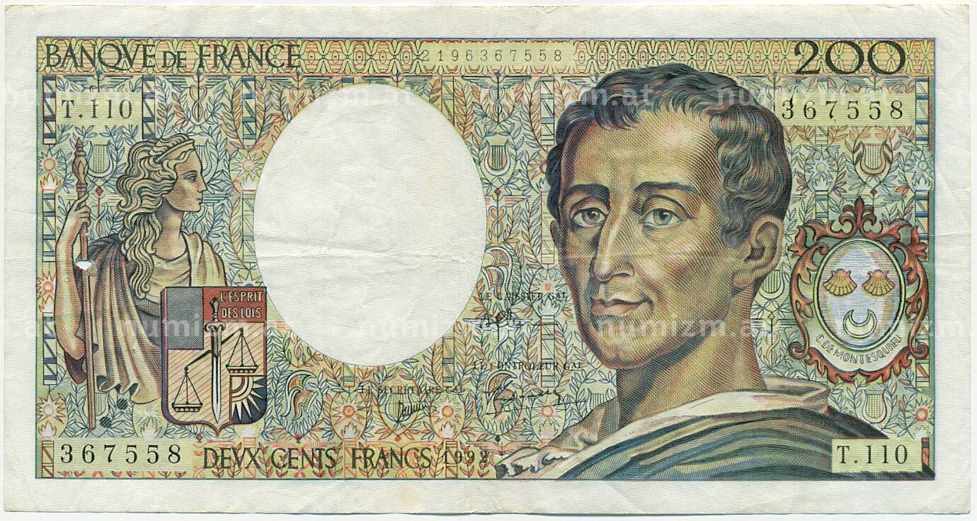 Банкнота 200 франков 1992 года Франция (Артикул: K10-9754): подробные характеристики, качественные фотографии в высоком разрешении, низкая цена.