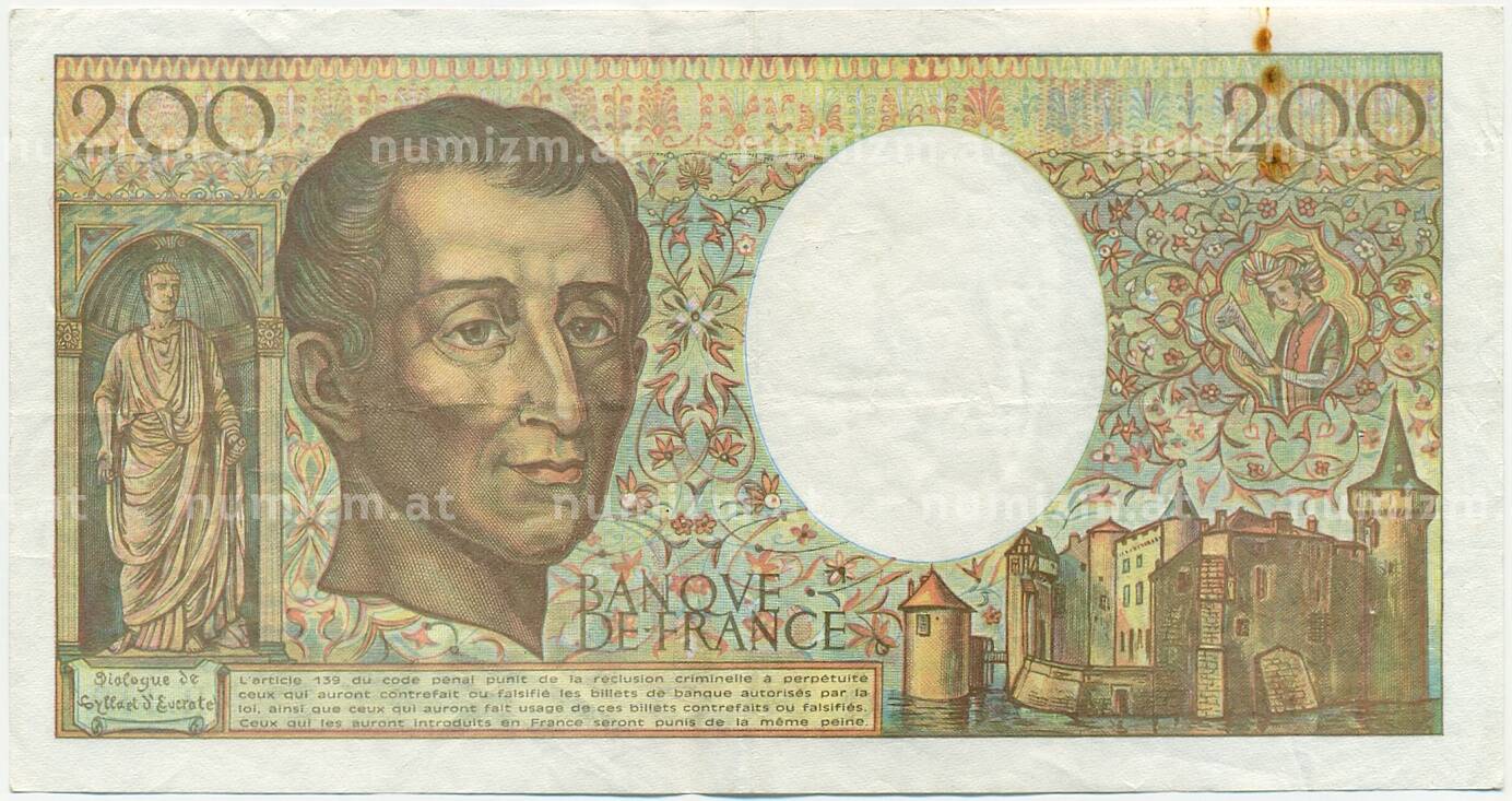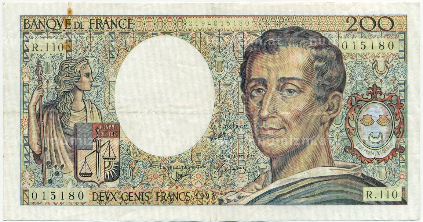 Банкнота 200 франков 1992 года Франция (Артикул: K10-9760): подробные характеристики, качественные фотографии в высоком разрешении, низкая цена.