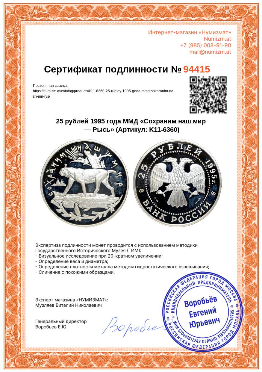 20.01.2025Интернет магазин «Нумизмат» предлагает приобрести 25 рублей 1995 года ММД «Сохраним наш мир — Рысь».